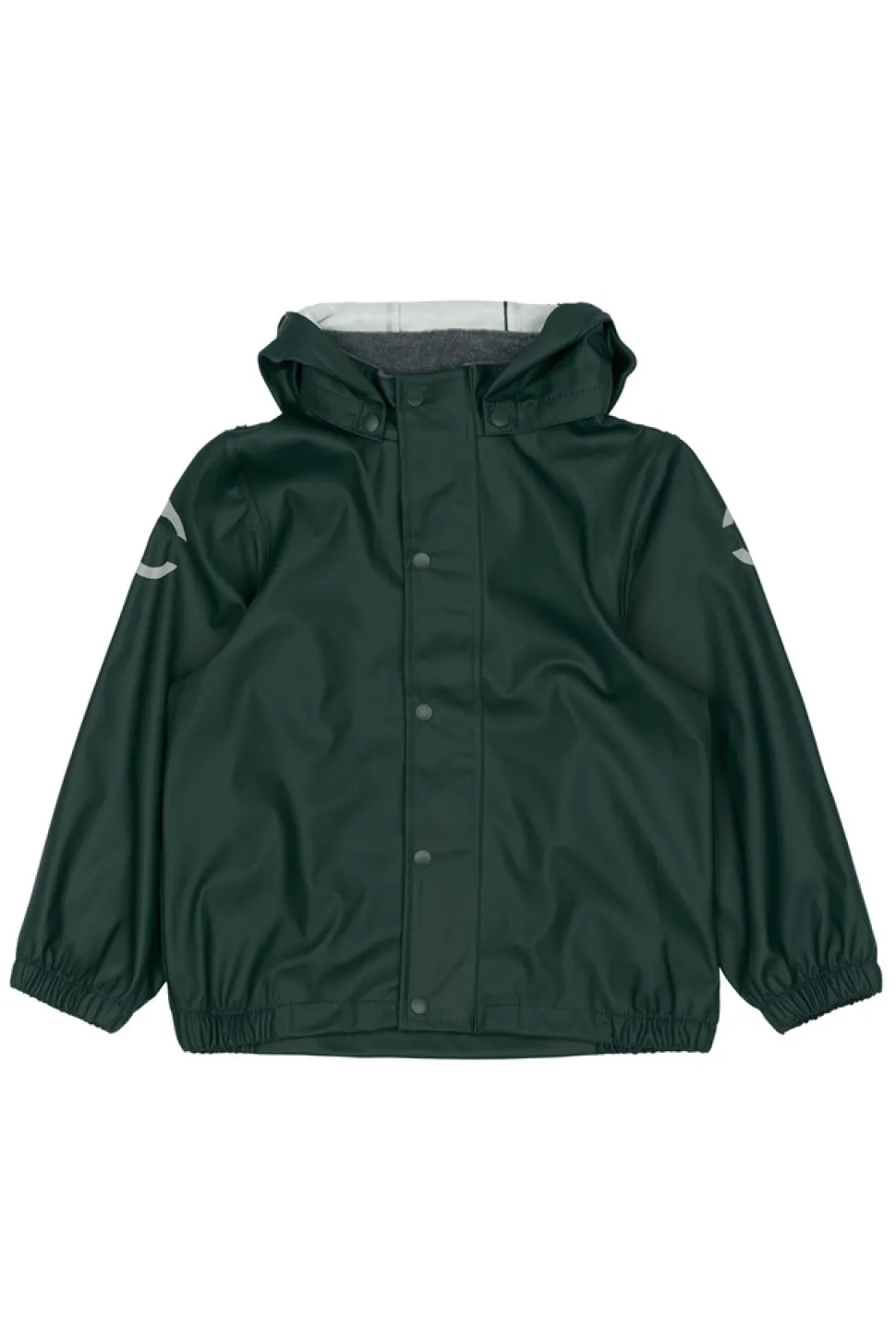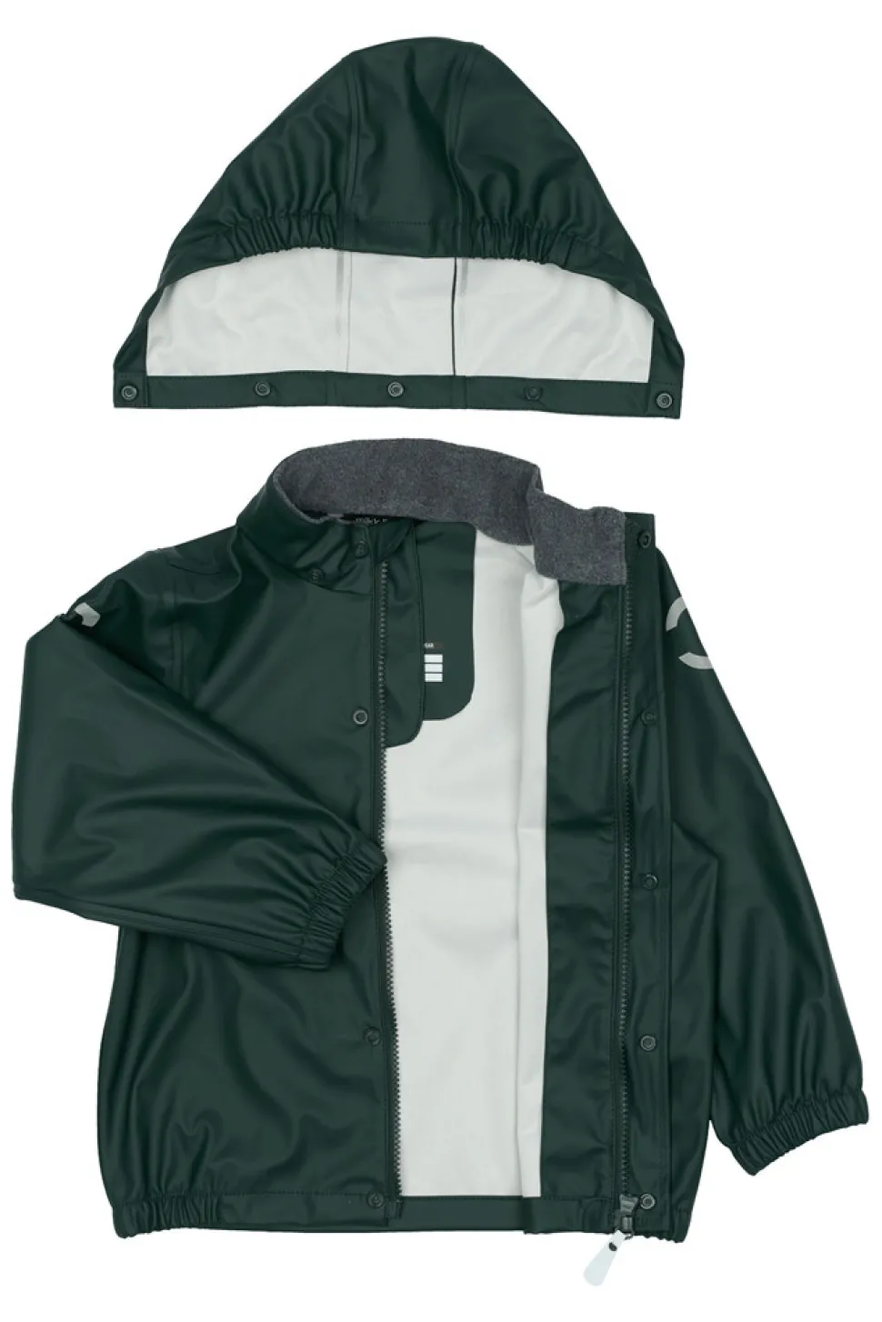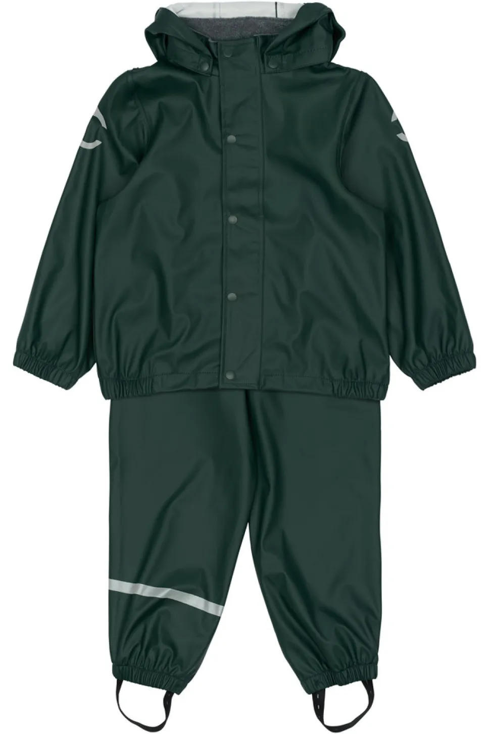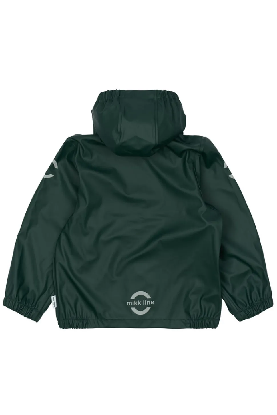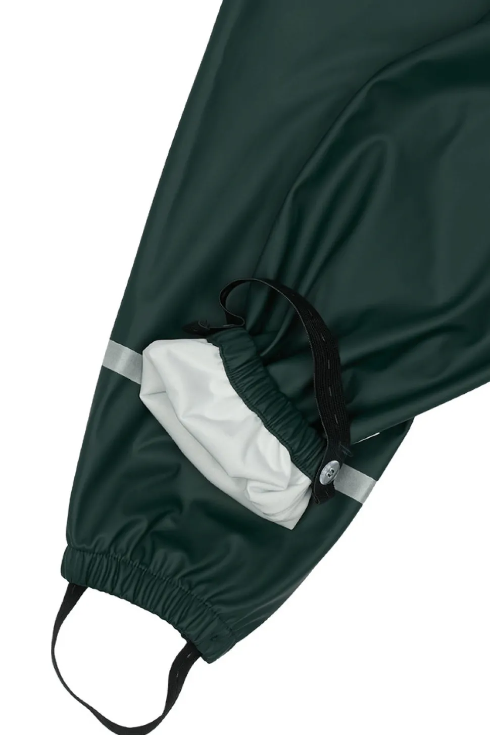 Praktisk og funktionelt recycled regnsæt fra mikk-line, der holder dit barn tørt. Regntøjet er udstyret med refleksdetaljer så dit barn kan færdes sikkert i mørket. Regnsættet er naturligvis både vand- og vindtæt. Sømmene er svejsede, hvilket forhindrer vand i at trænge igennem samlingerne. Buksen har fodstropper, som holder buksen under gummistøvlen. Regnbukserne har justerbare seler, tætsiddende elastik i taljen og et ekstra stykke stof der dækker både foran og bagpå kroppen.