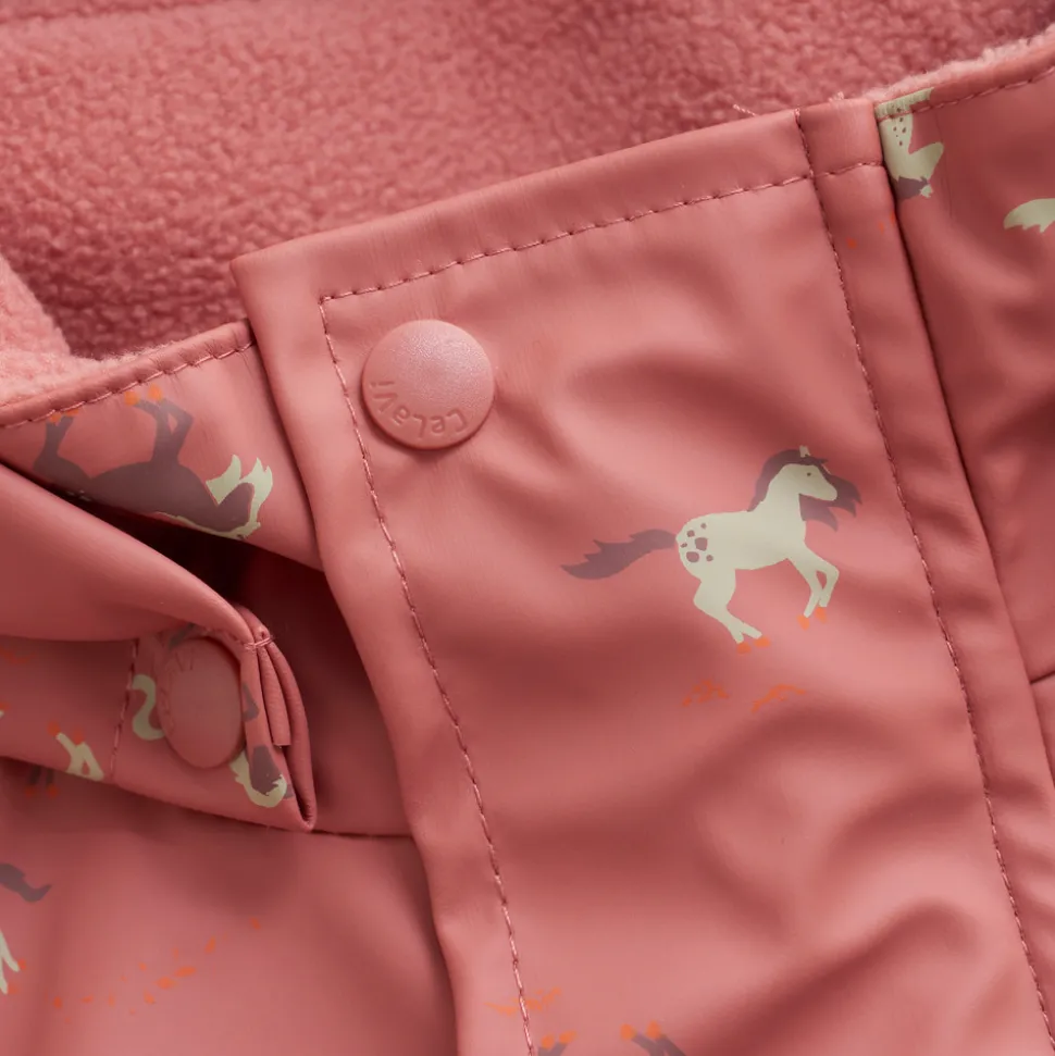 Regndragt med fleecefor fra CeLaVi – fremstillet i slidstærkt materiale med all-over print og lavet af genanvendelig polyester med PU-coating. Dragten er fuldt vandtæt med et testet vandsøjletryk på 10.000 mm og holder dit barn varmt og tørt i vådt vejr.