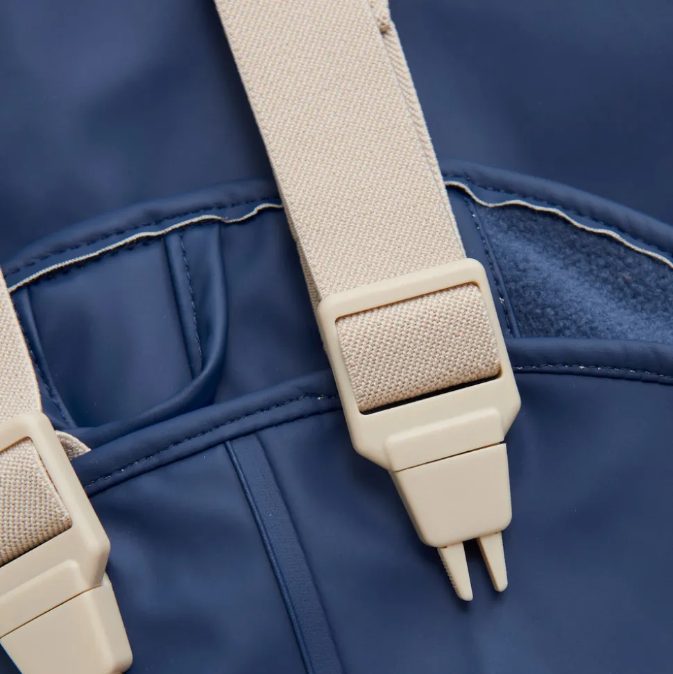 Størrelse 104 og derunder: Bukserne er designet som smækbukser med justerbare seler og plastspænde foran. De lukkes i siden med en trykknap.