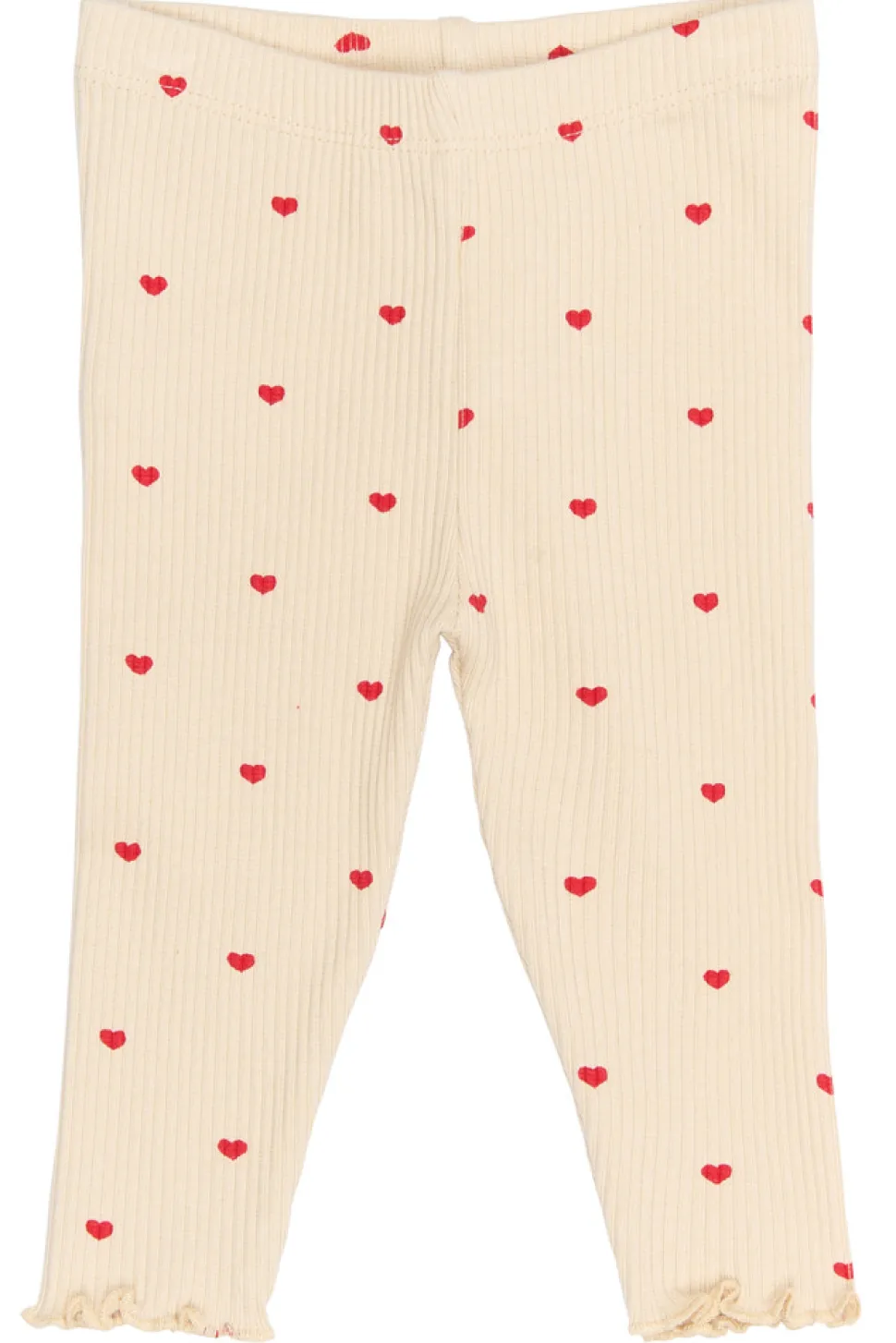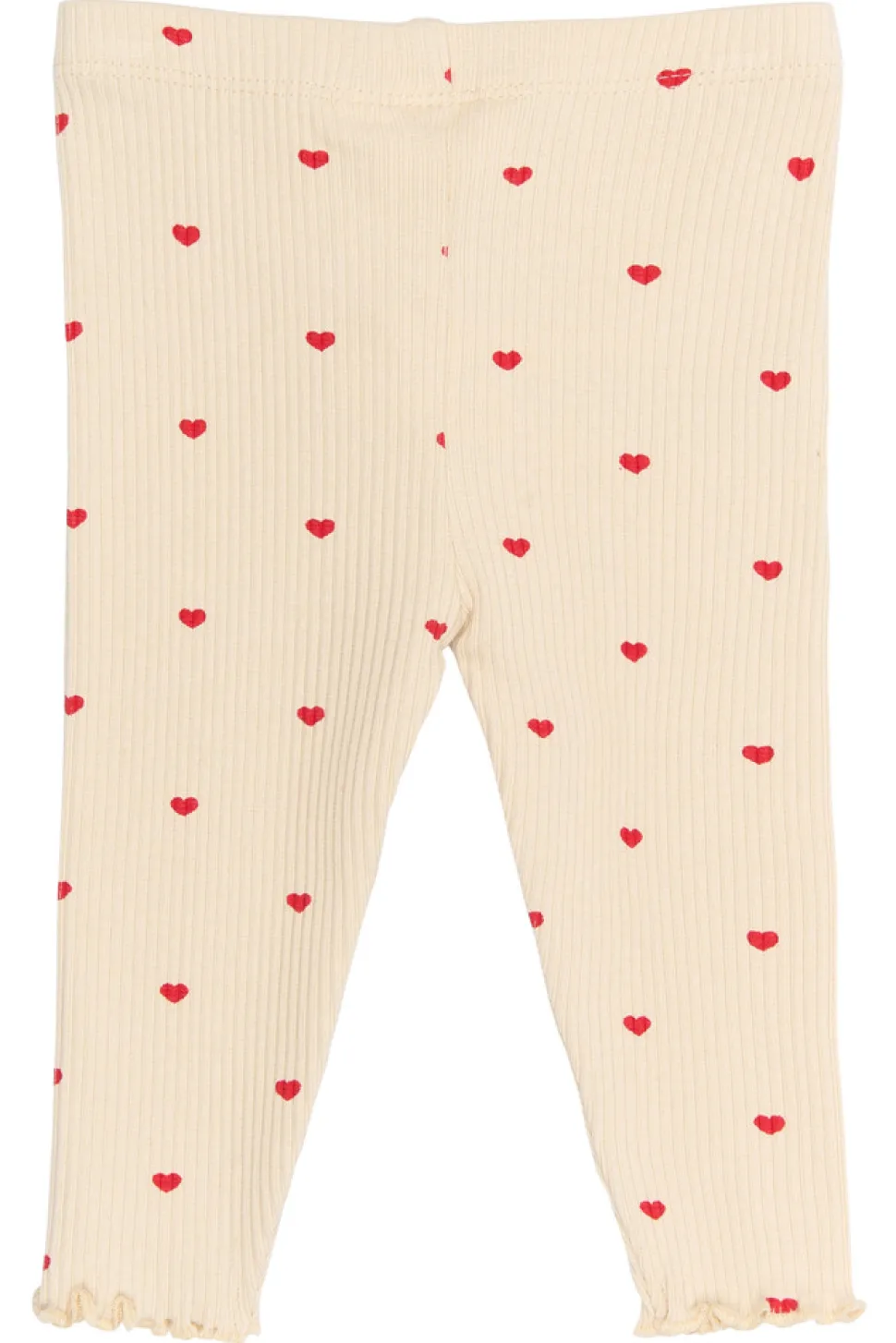 Disse leggings fra THE NEW Siblings er både bløde og søde – perfekt til de små. De har et charmerende all-over print af små hjerter og delikate flæsedetaljer ved anklerne, der tilføjer et feminint og legende touch. Den elastiske linning sikrer en behagelig pasform og stor bevægelsesfrihed til både leg og hverdagsbrug.