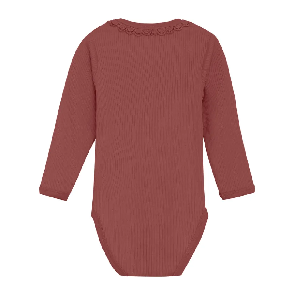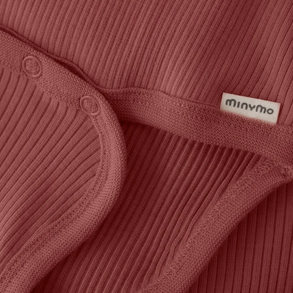 Sød ribstrikket body med lange ærmer fra Minymo. Bodyen er lavet i en blød og behagelig kvalitet, der føles skånsom mod barnets hud. Den har praktiske trykknapper mellem benene, som gør den nem at tage af og på.