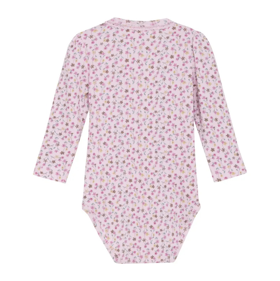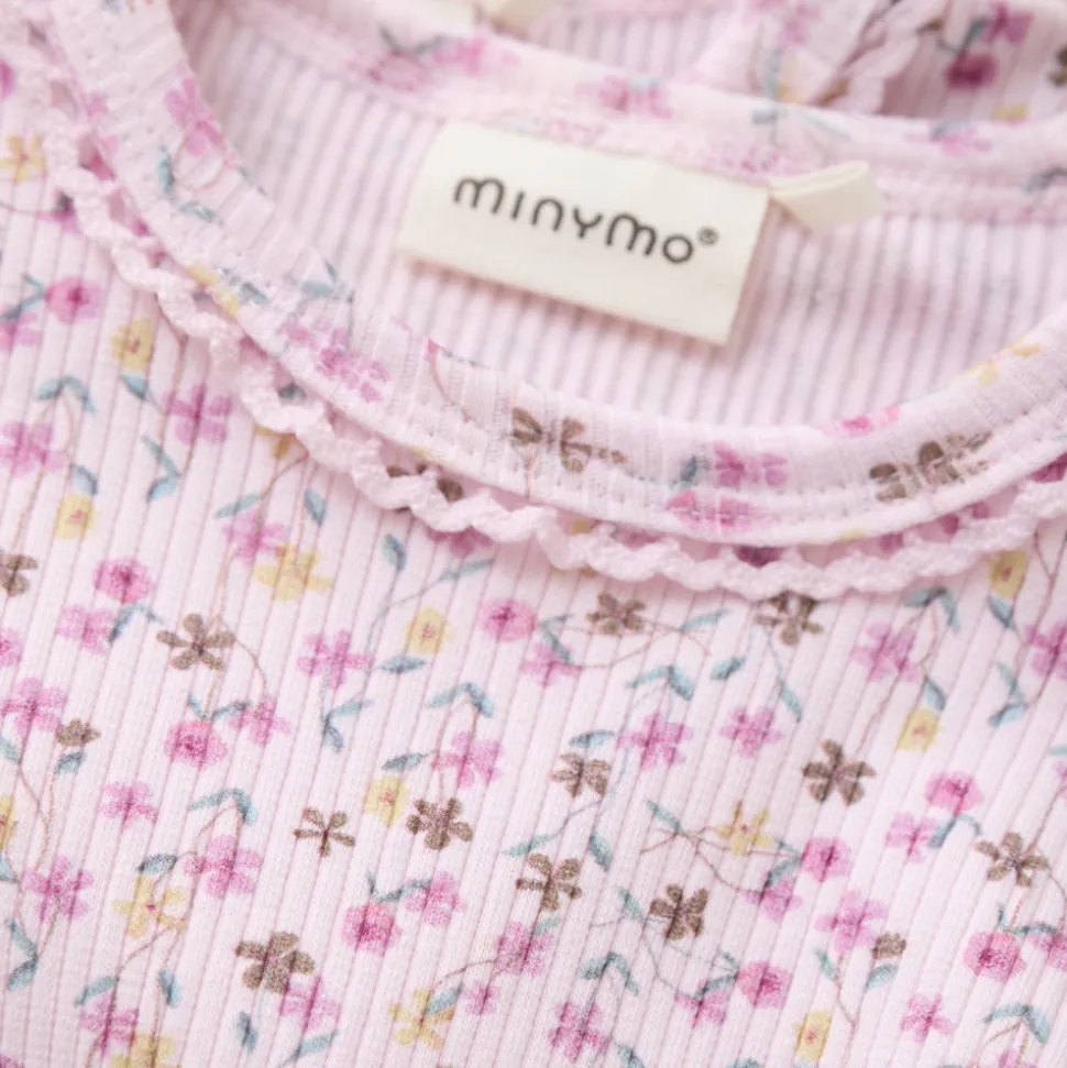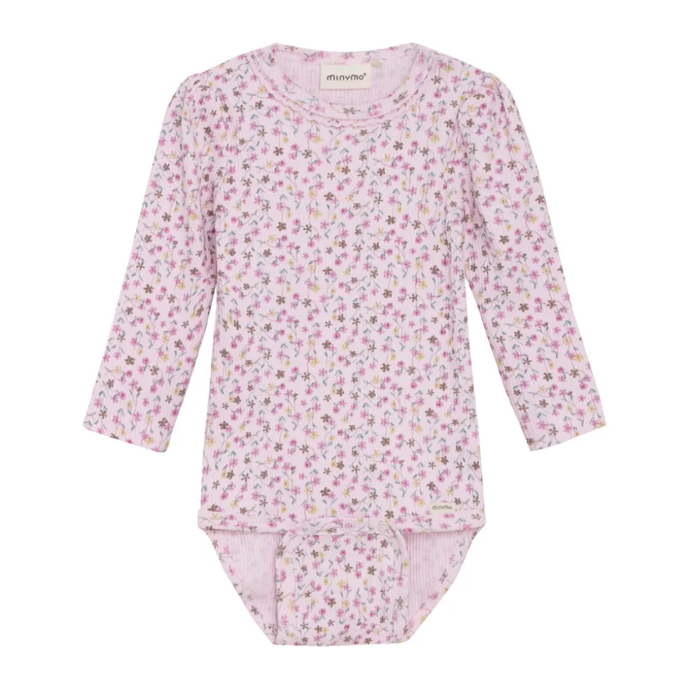 Langærmet body fra Minymo med yndigt blomsterprint. Bodyen er syet i en blød og komfortabel bomuldsblanding, der føles dejlig mod barnets hud. Den lukkes nemt med trykknapper mellem benene for praktisk påklædning og bleskift. Et lille Minymo-logo ved benet tilføjer en fin detalje til det søde design.