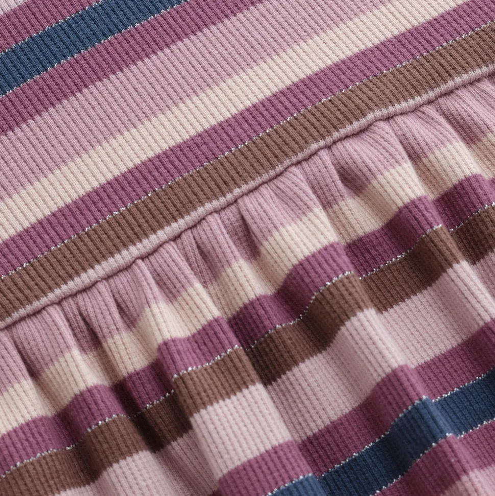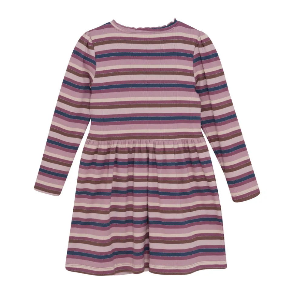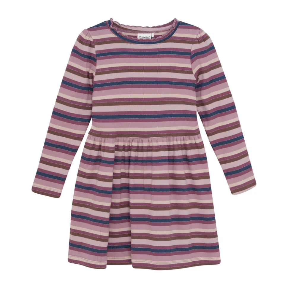 Fin og enkel langærmet kjole fra Minymo med et sødt stribet mønster og diskrete glitterdetaljer. Små læg ved skuldre, krave og talje tilføjer et elegant touch og sikrer en flot pasform.