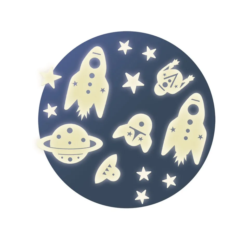 Skab den fineste drømmehimmel med disse fine selvlysende figurer. Pakken indehollder planeter, stjerner og rumskibe.