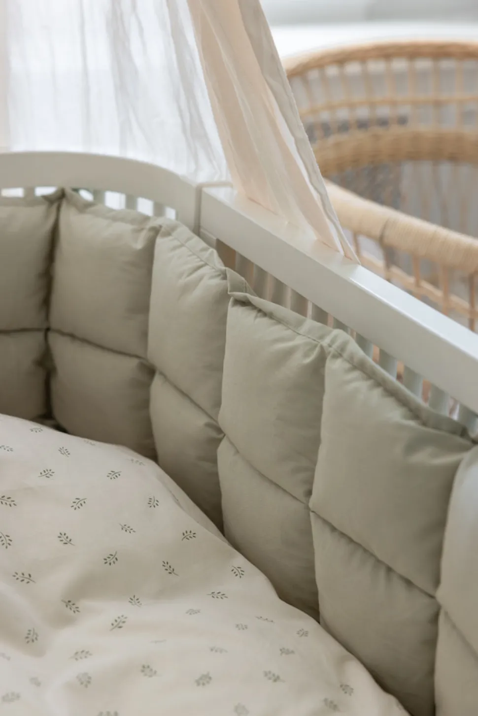 Sengeranden er godkendt og testet for åndbarhed.Sengeranden må kun bruges i barnesengens øverste position.Bindebåndene skal bindes og justeres med en knude på ydersiden af barnesengen.Af sikkerhedsmæssige årsager må der ikke laves en løkke.Sengeranden skal fastgøres med bundne knuder. I tilfælde, hvor bindebåndene i bunden af sengeranden ikke bliver brugt, skal disse klippes helt af således at babyen ikke kan komme i kontakt med dem.Funktionelle snore må ikke klippes af på grund af risikoen for optrevling.Stop med at bruge sengeranden ved de første tegn på skade.Anbefalet alder: 0-6 måneder.Sengeranden er testet og godkendt i henhold til EN 16780:2018 Tekstile børneomsorgsprodukter.