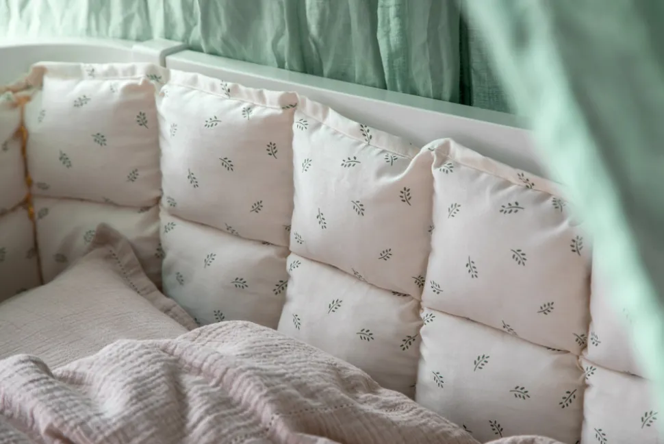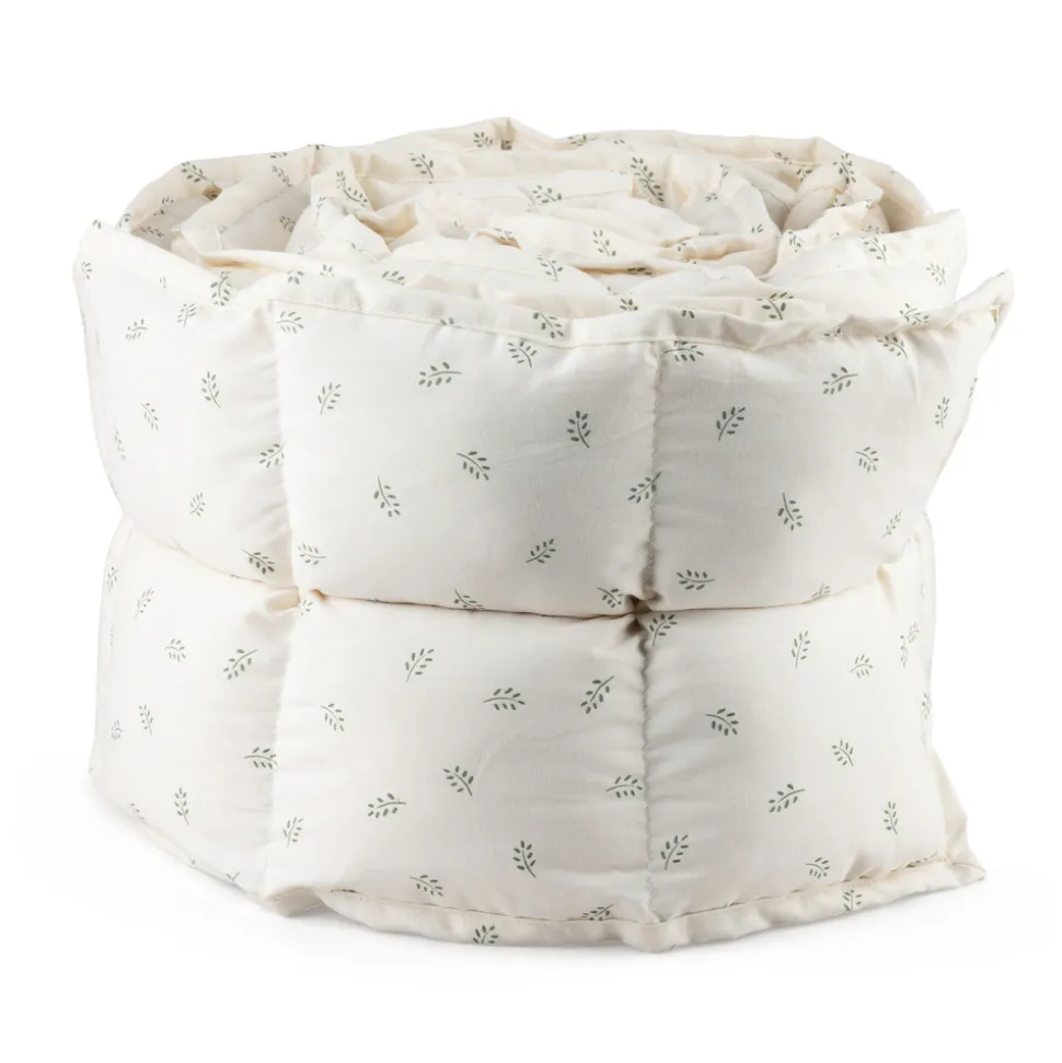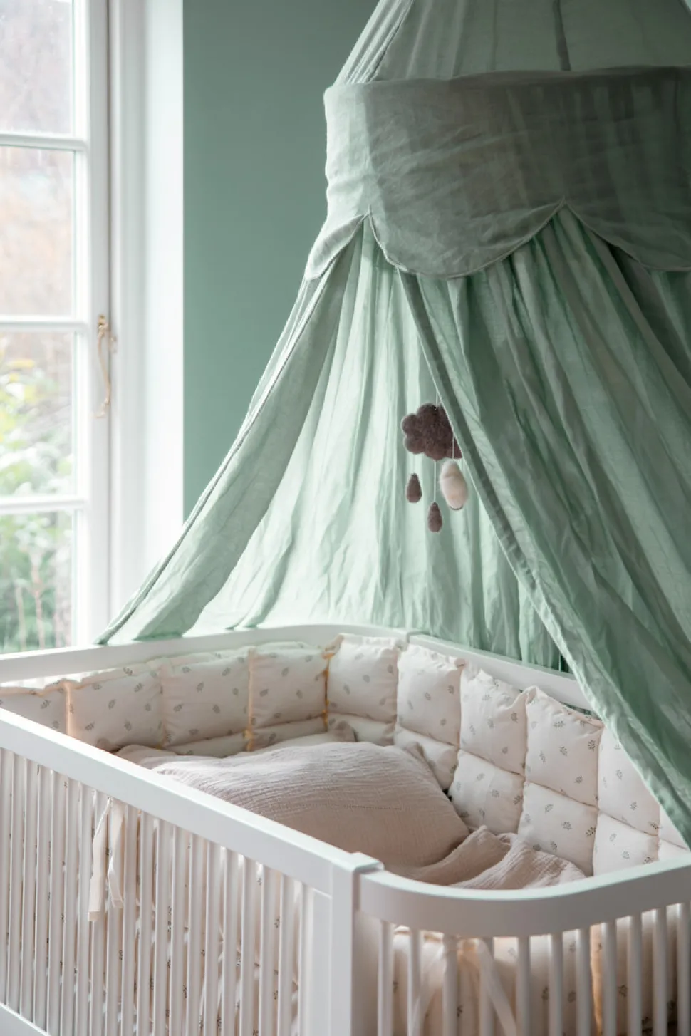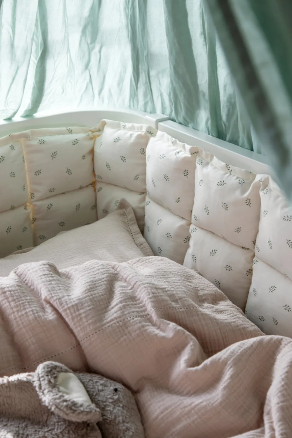 Sengeranden er godkendt og testet for åndbarhed.Sengeranden må kun bruges i barnesengens øverste position.Bindebåndene skal bindes og justeres med en knude på ydersiden af barnesengen.Af sikkerhedsmæssige årsager må der ikke laves en løkke.Sengeranden skal fastgøres med bundne knuder. I tilfælde, hvor bindebåndene i bunden af sengeranden ikke bliver brugt, skal disse klippes helt af således at babyen ikke kan komme i kontakt med dem.Funktionelle snore må ikke klippes af på grund af risikoen for optrevling.Stop med at bruge sengeranden ved de første tegn på skade.Anbefalet alder: 0-6 måneder.Sengeranden er testet og godkendt i henhold til EN 16780:2018 Tekstile børneomsorgsprodukter.