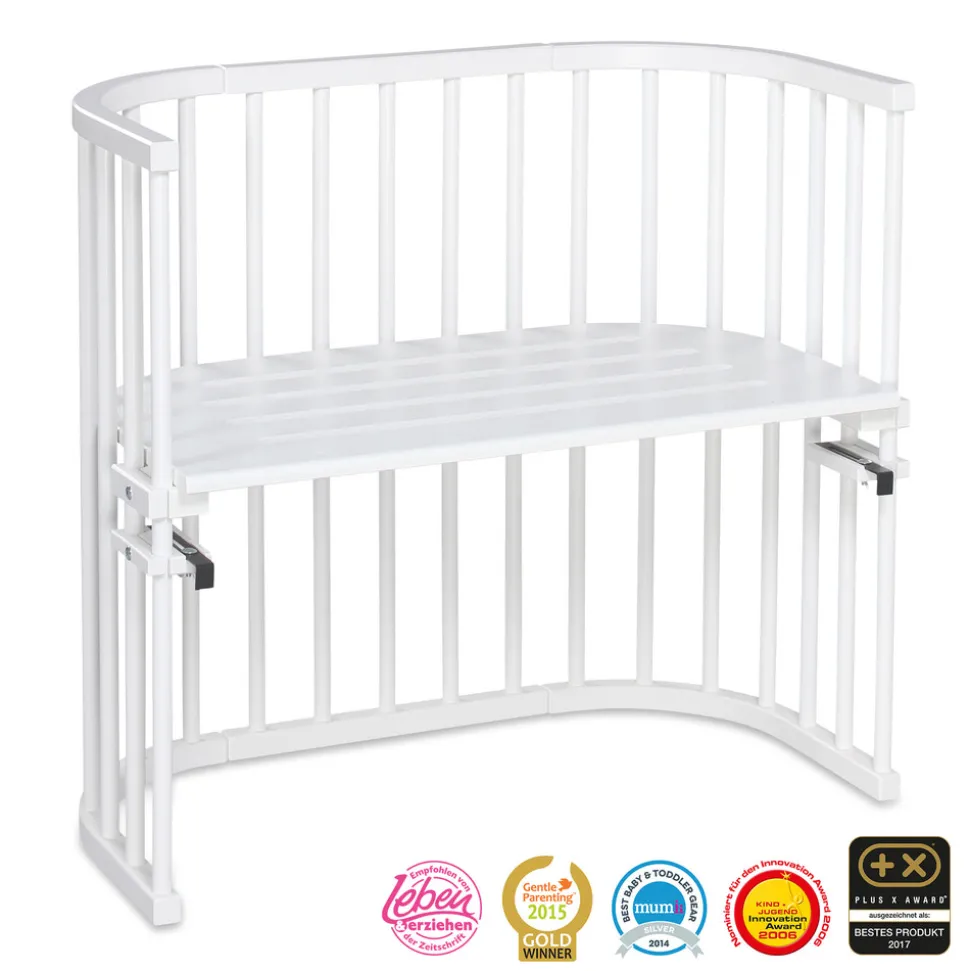 Med babybay Original begynder historien om alle co-sleepers i 2003. Deres bedst sælgende klassiker, elsket af jordemødre, i en afrundet form, som barnet var vant til under graviditeten. Takket være den unikke og trinløst højdejustering kan liggefladen justeres nøjagtigt til enhver sengehøjde – intet trin, intet mellemrum.