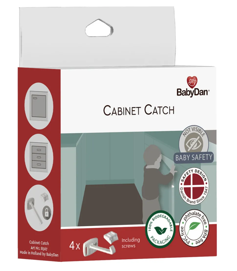 Skuffe-/skabslås. Til indendørs brug i hjemmet. Usynlig udefra. Off funktion for lettere adgang ved madlavning mv. Små dele skal opbevares utilgængeligt for børn. Testet fri for giftige stoffer som ftalater, BPA og PVC. Emballagen er 100 % bionedbrydelig, Cradle-to-Cradle certificeret emballage
