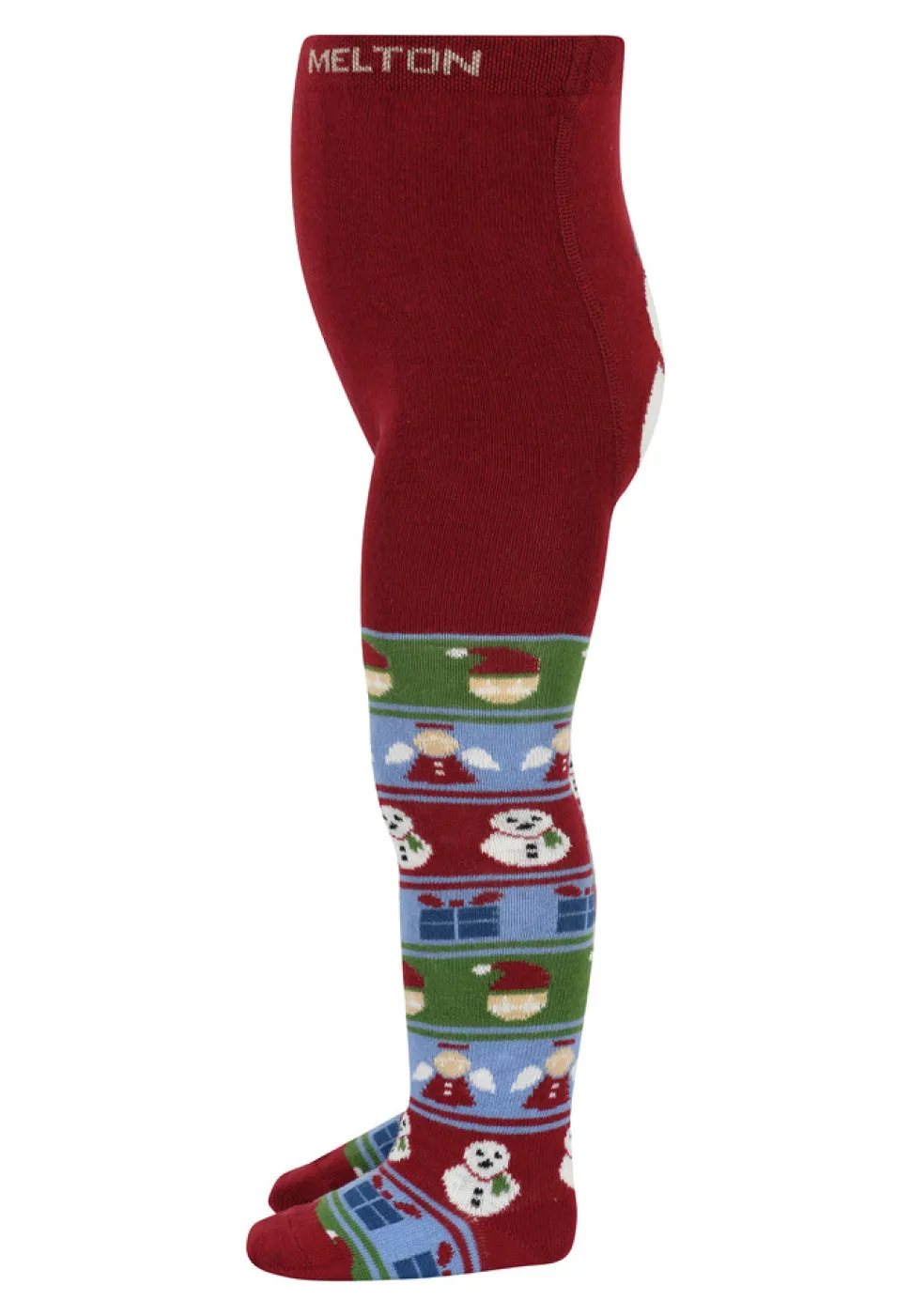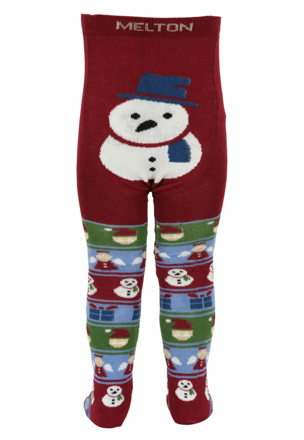 Bomuldsstrømpebukser fra MELTON. Strømpebukserne har charmerende motiver af snemænd, engle, gaver og nisser samt en større snemand på bagsiden.