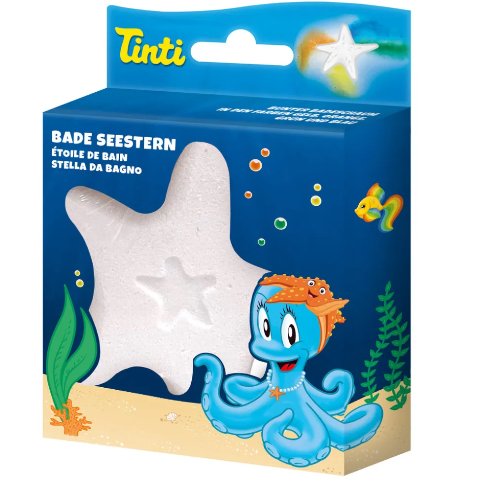 Stor og magisk søstjerne, der flyder rundt i overfladen, mens de afgiver et tapet af fine farver. Oplev farverne gul, orange, grøn og turkis strømme fra stjernen, mens den langsomt bliver opløst. Når den er færdig med at blive opløst, er vandet i en fin grøn farve og dufter af jordbær. Den er pakket med et lille vindue, så barnet kan kigge på søstjernen inden den kommer i brug.