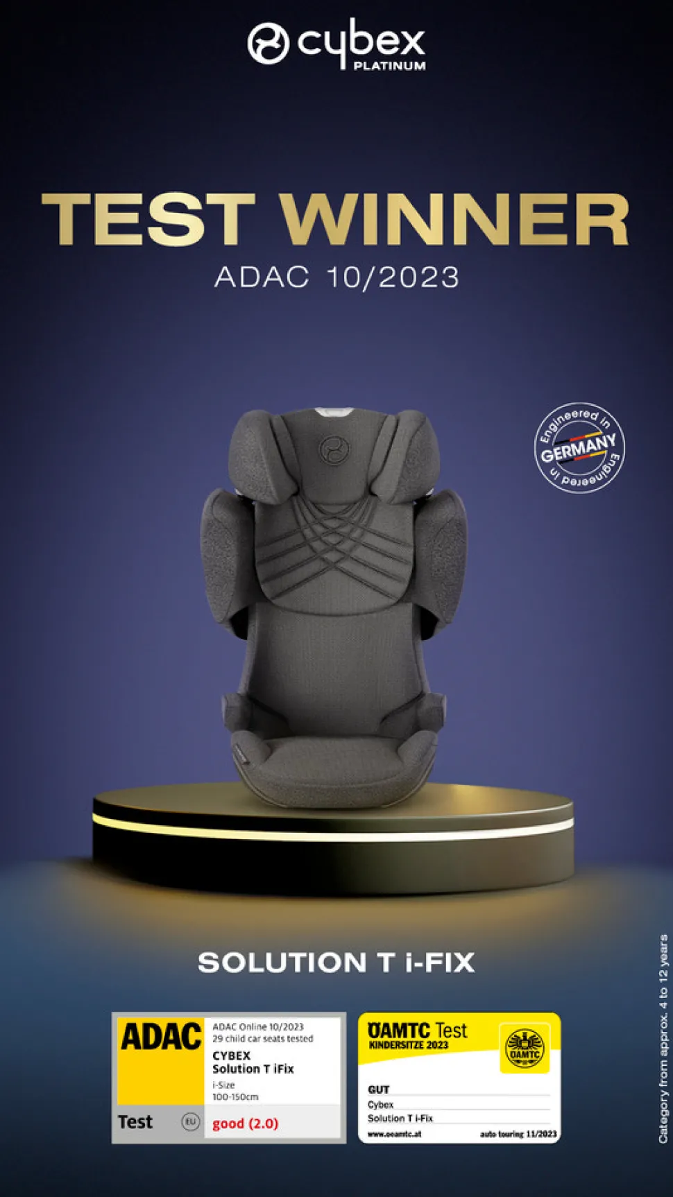 Cybex Solution T i-Fix er af ADAC og Stiftung Warentest kåret testvinder i kategorien autostol fra 4-12 år, med et imponerende testresultat på 2,0. Takket være den patenterede hovedstøtte som holder den dit barns hoved 7 x mere sikkert i sikkerhedszonen og den justerbare højde og breddefunktion er det den perfekte løsning for børn på 4-12 år, som også kan sidde køligt på turen takket være den forbedrede luftventilation.