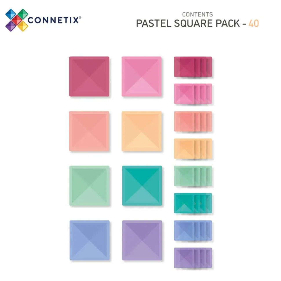 Forøg dine Connetix-kreationer med Square Pack – et magnetsæt med 40 dele i pastelfarver. Sættet indeholder både store og standard firkanter i alle pastelfarver, hvilket giver uendelige muligheder for byggeri. Skab højere tårne, længere dominobaner, mere robuste kuglebaner, imponerende slotte, parkeringspladser, markedsboder og meget mere. Connetix vokser med børnene, efterhånden som de lærer og deres leg bliver mere avanceret.