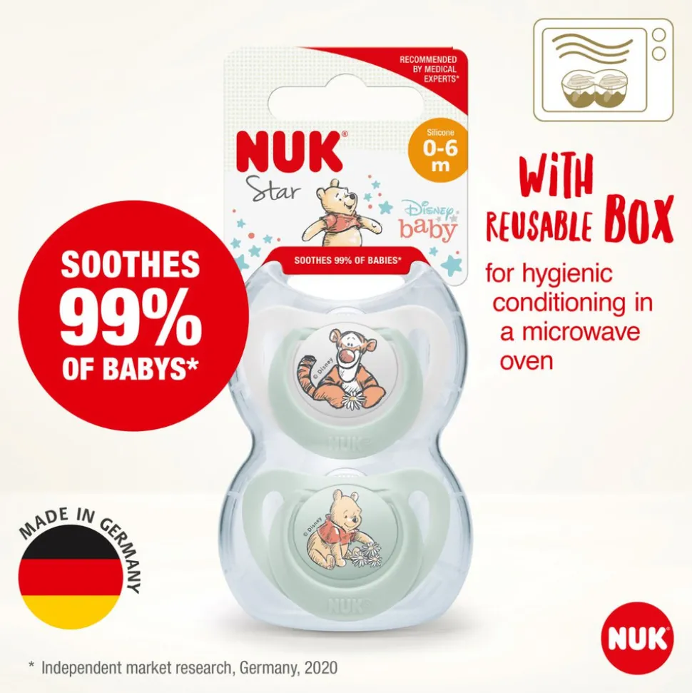 NUK Pacifier Star Silicon sutt er ortodontisk designet til at passe til det lille barns anatomi.Sugedelens overside ligger blødt mod ganen, og undersiden giver plads til tungens naturlige sugebevægelser. Fordi sugedelen er smal og flad, er der næsten ingen belastning af tænder, kæbe eller gane.Takket være NUK Air System kan luft strømme frit gennem sugedelen, hvilket betyder at sutten bevarer sin form, når barnet sutter.Sutten kan hurtigt og nemt steriliseres i mikroovnen ved hjælp af den medfølgende opbevaringsboks.Videnskabeligt bevist: NUK-sutter er bedst til tænder, kæbe og gane!I et uafhængigt forskningsstudie udført af University of Minho i Portugal har sutterne fra NUK fået det bedste i test på grund af deres ortodontiske form.Det 3 år lange forskningsstudie (2019-2022) er lavet ved hjælp af computersimulering, hvor man kan se, hvor meget tryk de forskellige former på sugekopper giver.Undersøgelsen viser, at sutter fra NUK har minimal indvirkning på både fortænder og kindtænder og giver det mindste tryk på ganen af alle testede sutter.Dette mindsker risikoen for deformeret gane og biddefekter såsom åbent bid, krydsbid eller fremspringende fortænder.