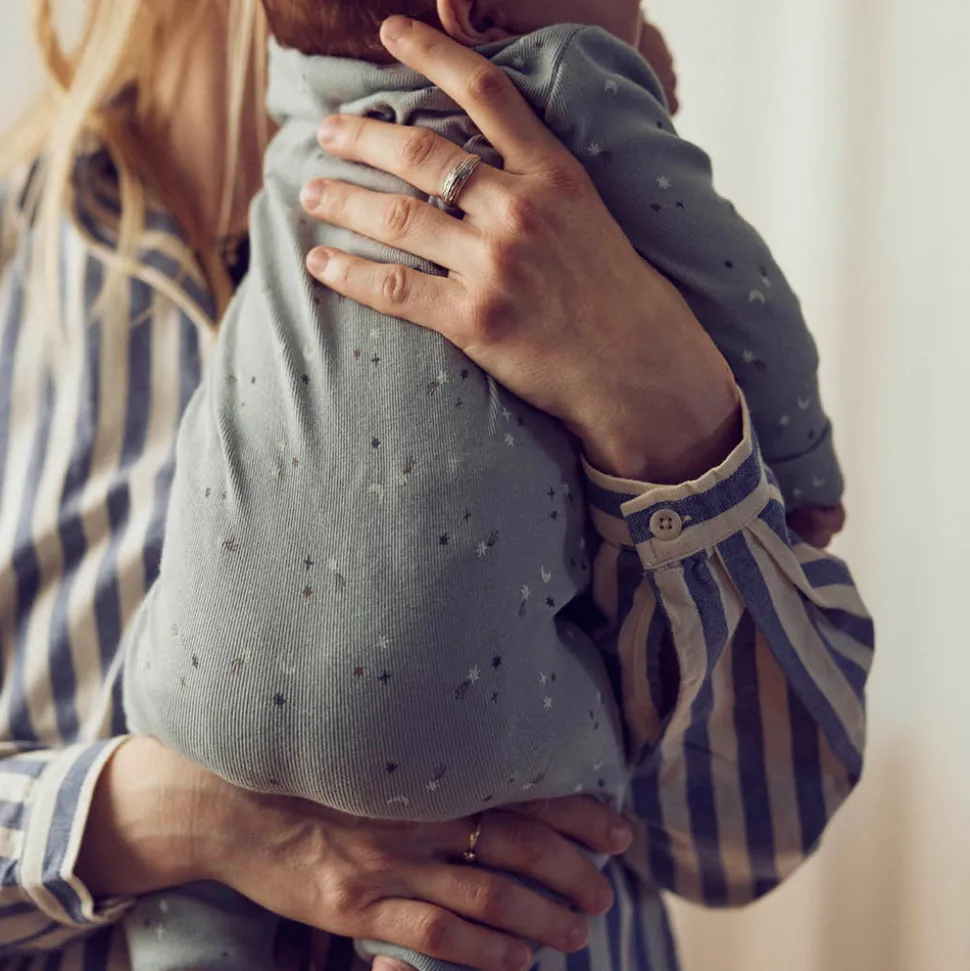 Skøn heldragt i blød blød rib kvalitet. Smukt gennemgående print af stjerner. Heldragten lukkes fortil med tryklåse og har vendbare fødder og hænder. Dragten er perfekt til de små for at sikre at de ligger lunt og trygt. De vendbare fødder og hænder kan foldes efter behov.