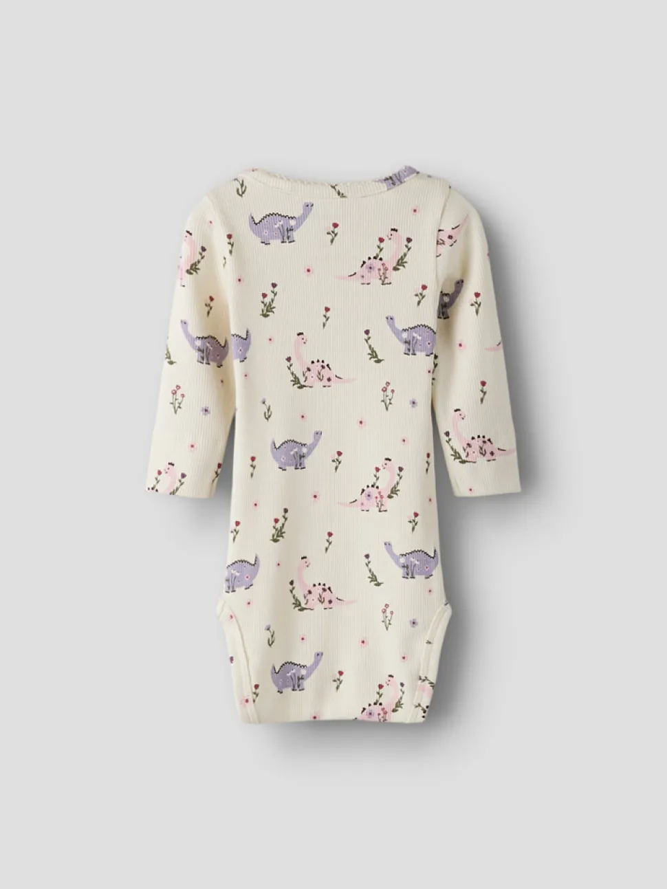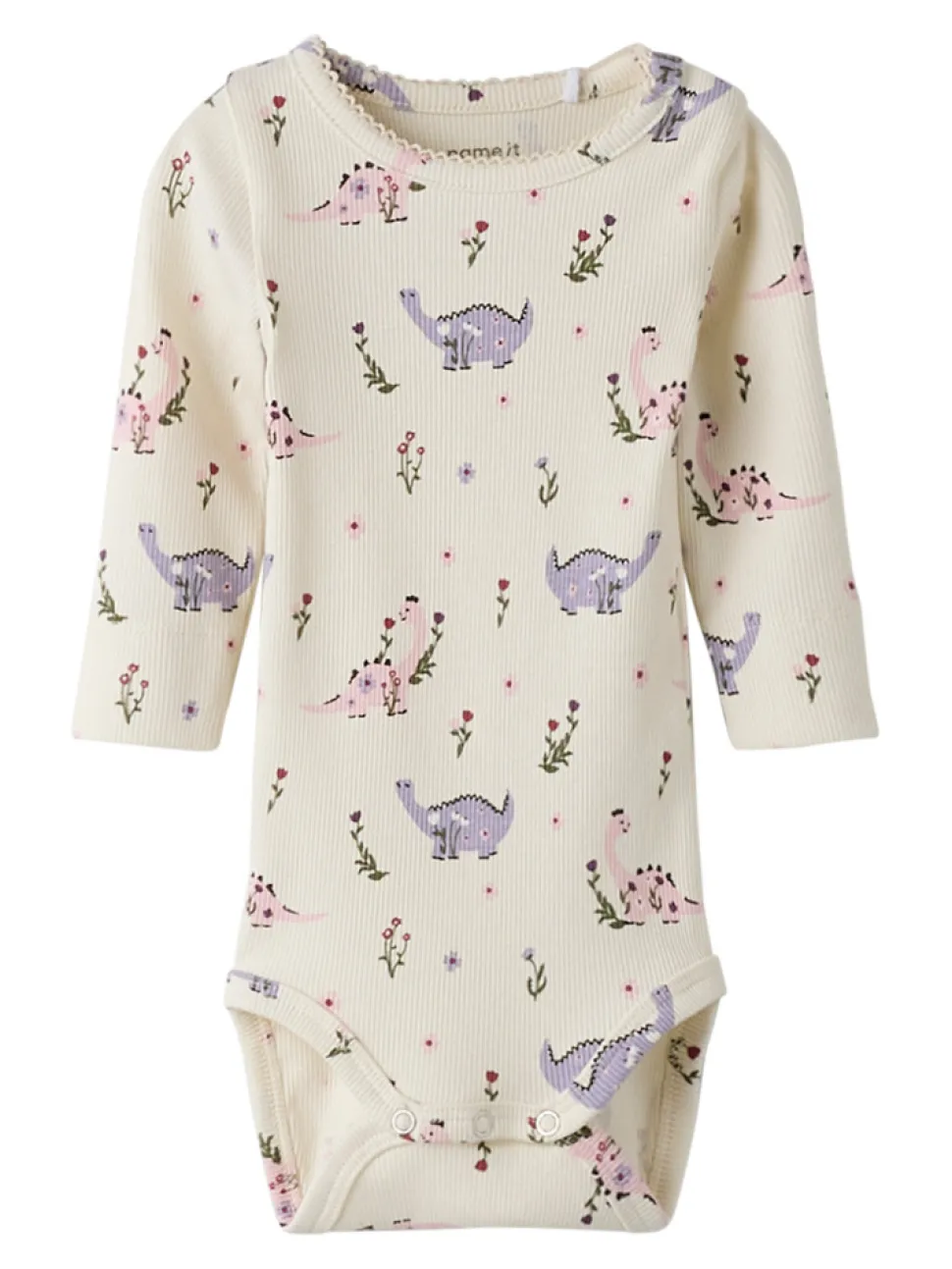 Stella Langærmet Body fra NAME IT er et skønt valg til de mindste. Bodyen har et charmerende print med små dinosaurer og blomster, der giver et legende og sødt udtryk. Den bløde ribstruktur sikrer, at bodyen føles behagelig mod barnets hud, og de lange ærmer holder baby varm på kølige dage. Med praktiske trykknapper i bunden bliver bleskift nemt og hurtigt, og den elastiske halsudskæring gør det let at tage bodyen af og på. NAME IT er kendt for deres fokus på komfort og funktionalitet, så du kan trygt vælge denne body til din baby. Perfekt til både hverdag og hygge.