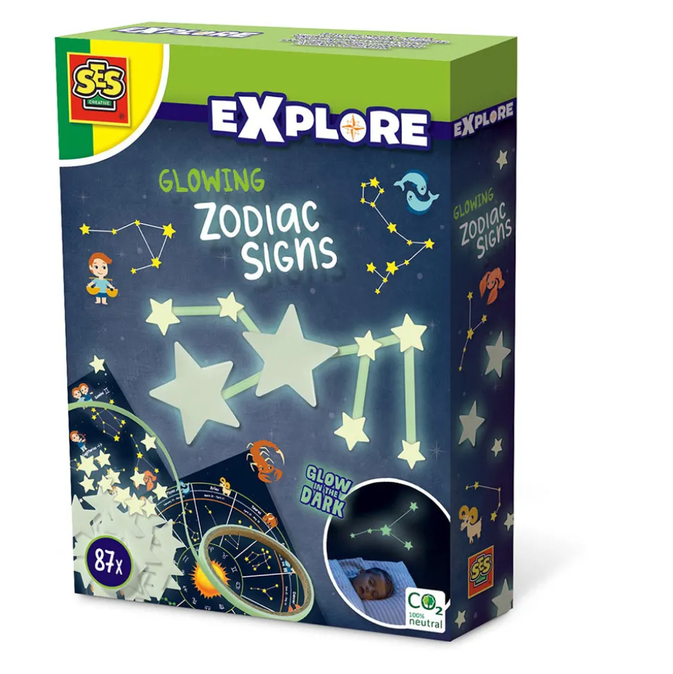 Indhold: 40 plastik stjerner, 46 stjerner (klistermærker), 3 meter tape. Alle stjerner såvel som tape lyser i mørke. Informationer om stjernetegnene er vedlagt.