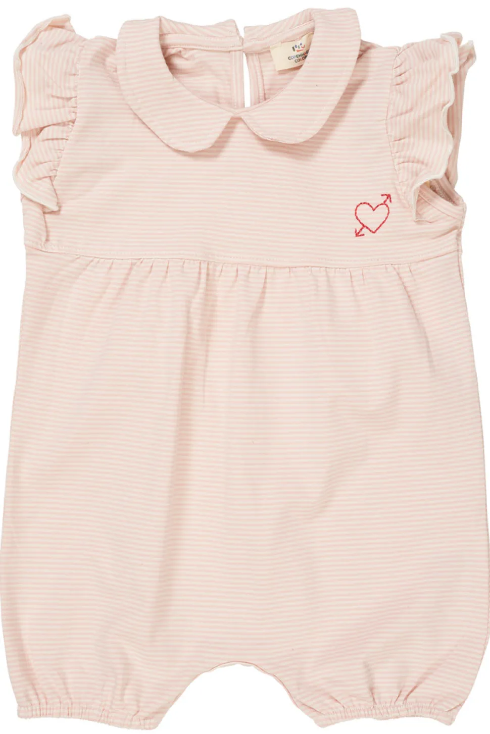 Tilføj et legende præg til din babys garderobe med denne stribet romper med broderi. Den er lavet af blødt, åndbart stof, hvilket sikrer komfort hele dagen. De søde striber kombineret med den delikate brodering giver et sødt udtryk. Den praktiske knaplukning og trykknapper i bunden gør bleskift nemt og hurtigt. Perfekt til både legeaftaler og festlige anledninger, denne romper er et must-have til de varme dage.