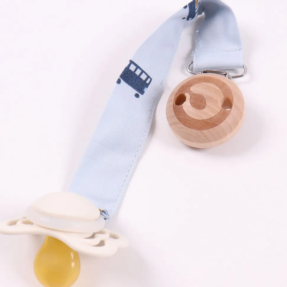 Sutte-snoren har en metalklips med træ ovenpå så man kan påsætte snoren på trøjen så sutten ikke bliver væk. På enden af sutte-snoren sidder der en gummiring som kan holde på flere forskellige slags sutter. Produktet er GOTS organic- certificeret, hvilket betyder at bomulden er certificeret økologisk, og at der i alle andre processer som farvning, strikning og syning er taget de strengeste hensyn til miljøet. GOTS er internationalt anerkendt som den førende standard for forarbejdning af tekstiler af økologisk bomuld. Derudover tages der også hensyn til arbejdsforholdene, hos dem der producerer tøjet. Økologisk bomuld 100%. (GOTS Organic Certified by Ecocert Greenlife Lic. No. 152033).