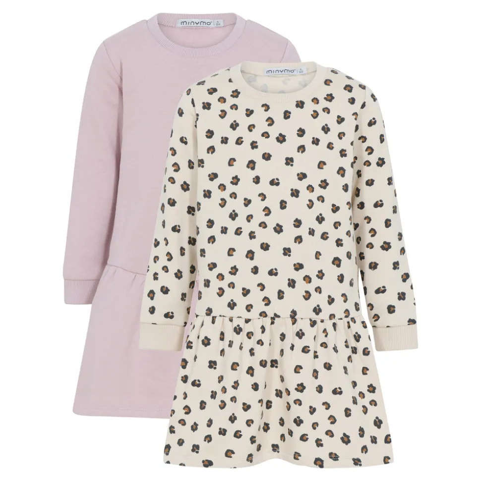 2-pak med søde sweatkjoler i 2 fine farver. Kjolerne har rynket skørte og bølget kant forneden samt bløde ribkanter ved hals og håndled. En sweatkjole holder barnet varmt og er blødt og behageligt at have på.