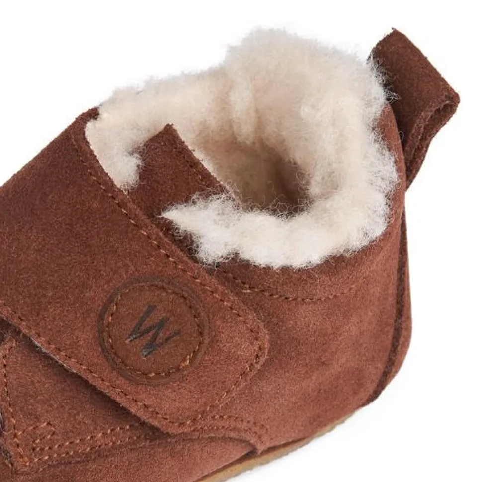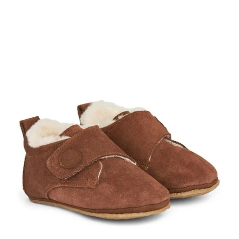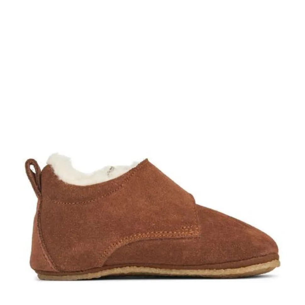 Varme og hyggelige hjemmesko med velcrolukning og uldfoer til din baby.