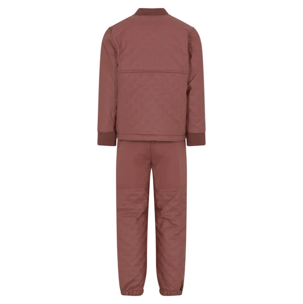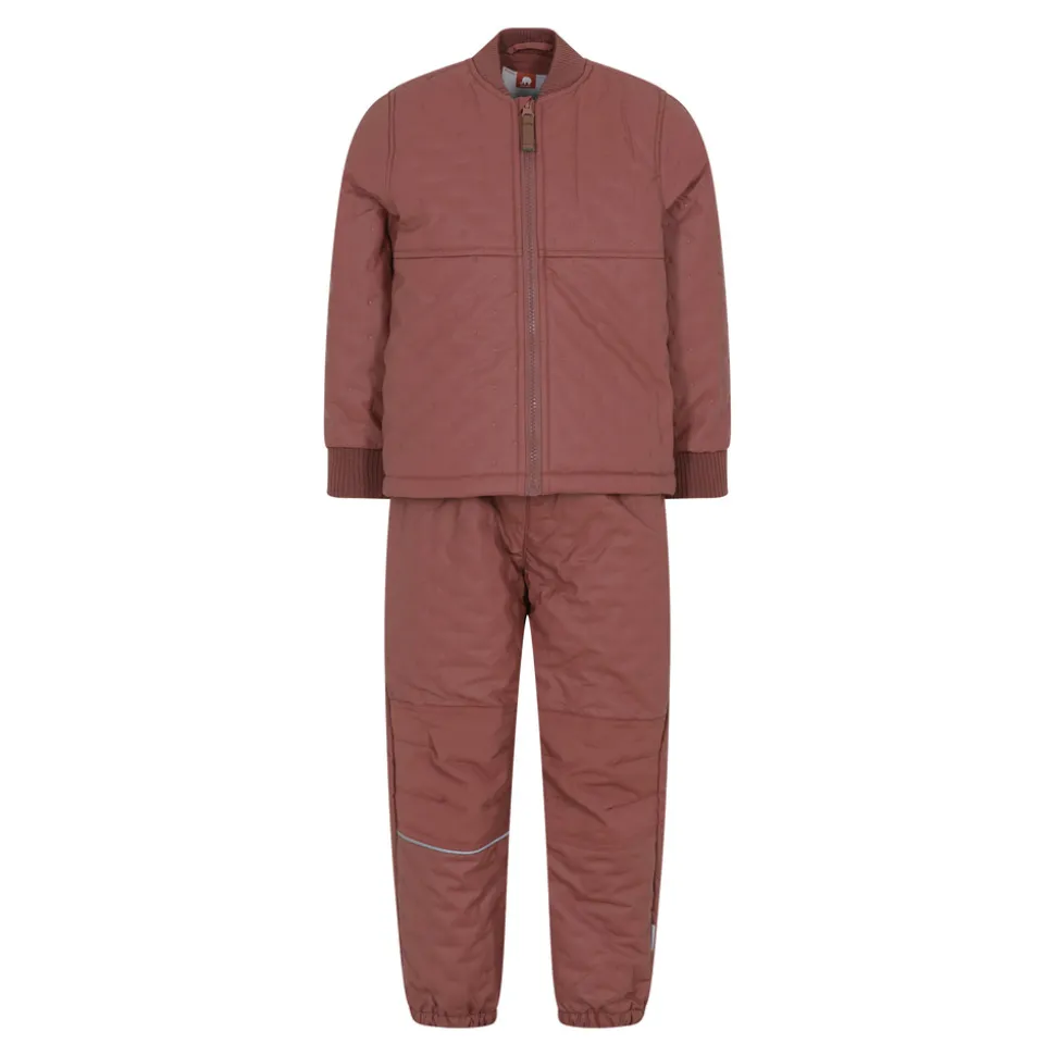 Termotøj med PU-belægning, som gør termotøjet vandtæt. Derudover er sættet foret indvendigt. Ekstra forstærket på knæ og bagpå på bukserne. Bukserne har desuden elastik i talje og ved ankler. Jakken har ribkant ved hals og håndled samt lynlåslukning. CeLaVi-logo foran.