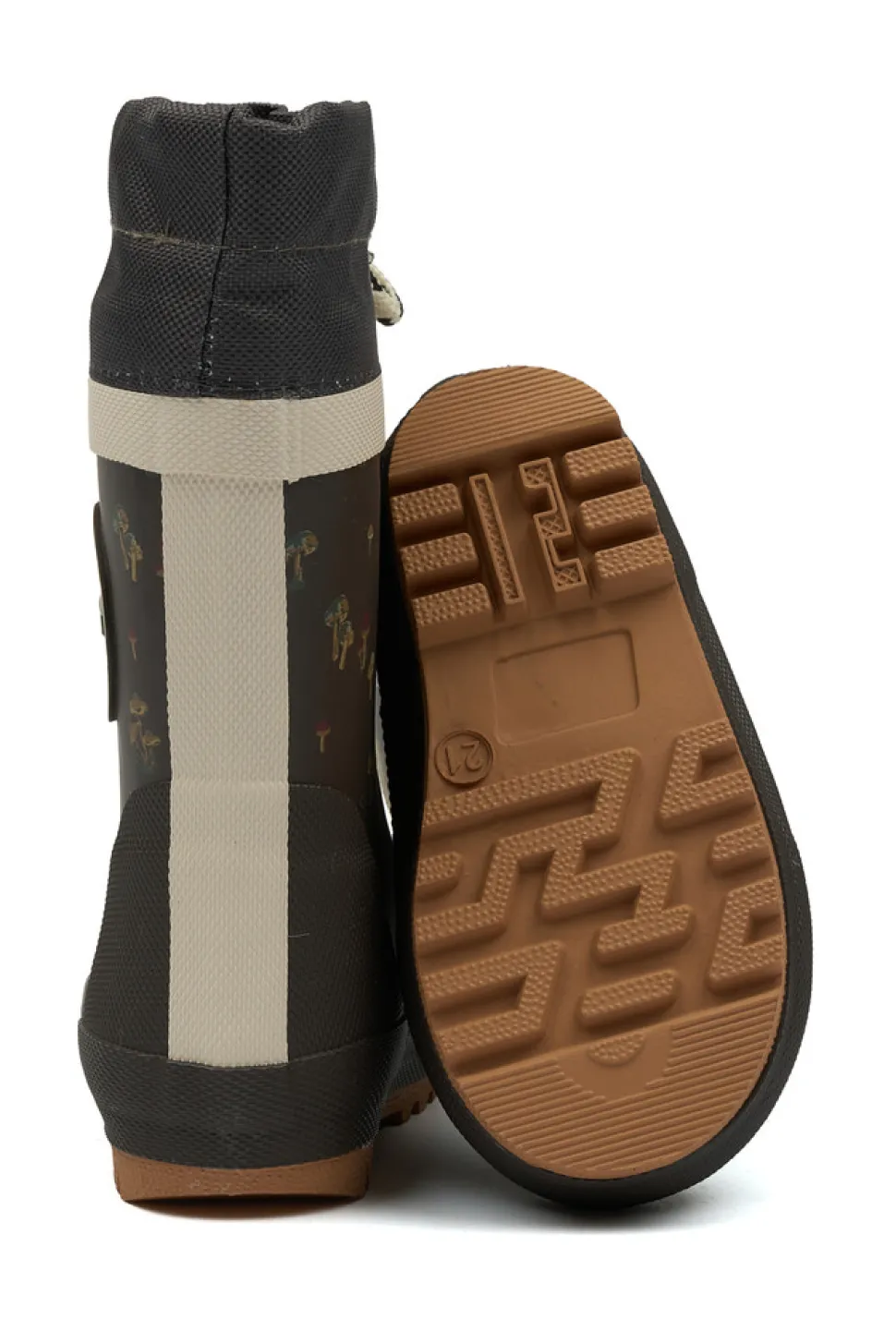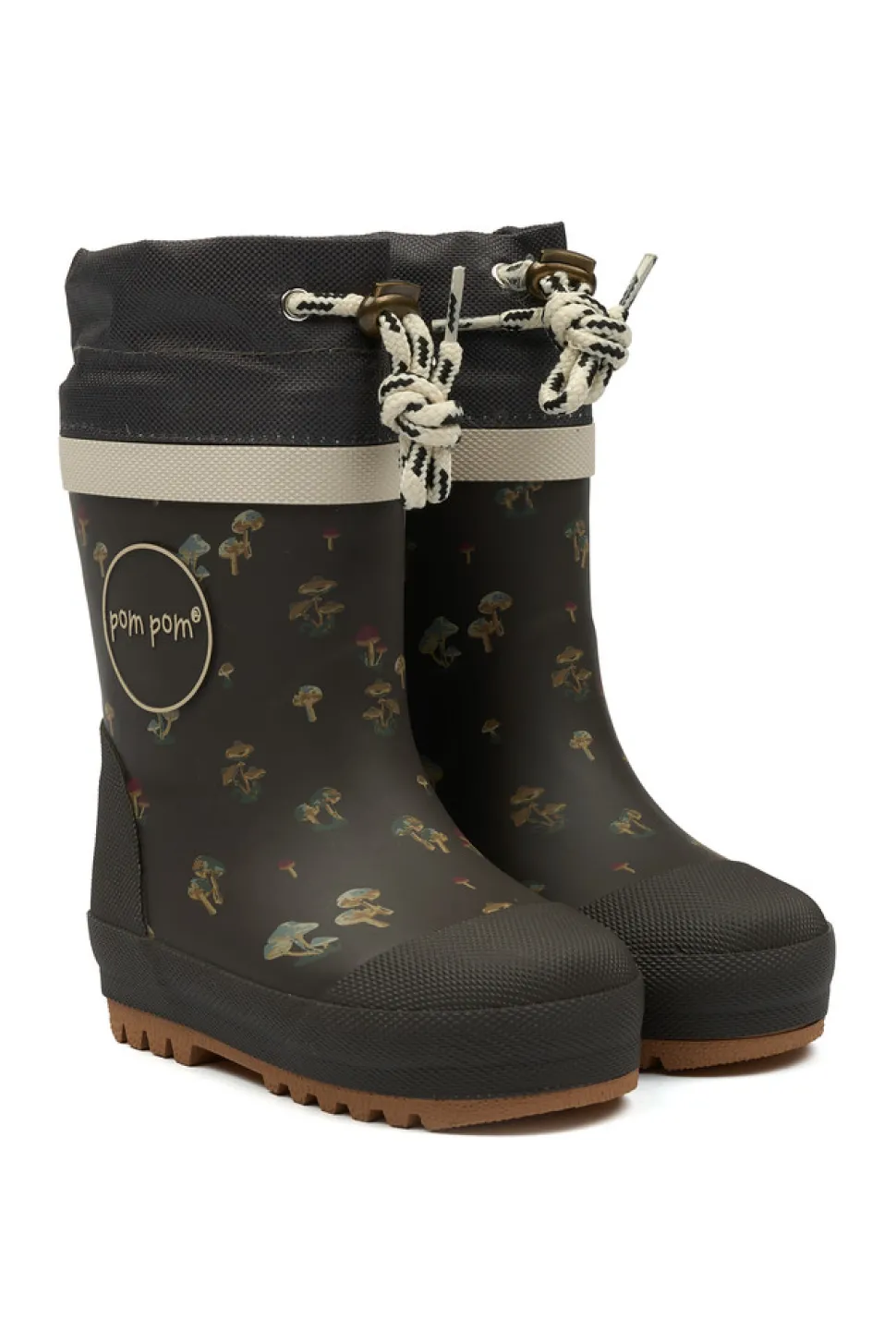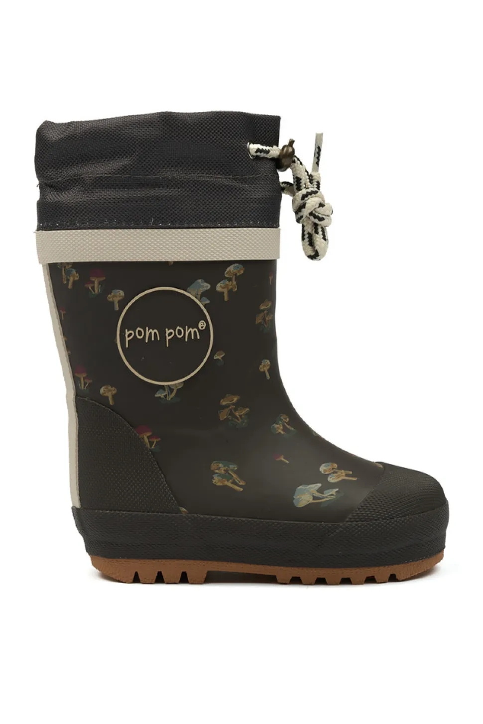 Pom Pom® GumBoots™ Thermo er en smuk gummistøvle i naturgummi med et mat look og logo på siderne. Støvlen er højere og har en bred tekstilkant øverst. Tekstilet kan strammes med en fin snor og en metalstopper. Indersiden er foret med blød uld, og bunden har en aftagelig sål. Støvlen er blød og fleksibel, og sålen har et ribbet mønster, der giver godt fodfæste.