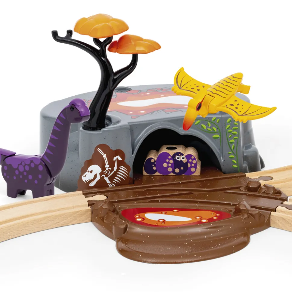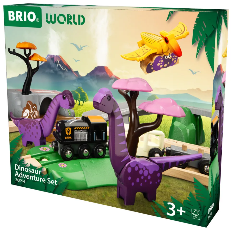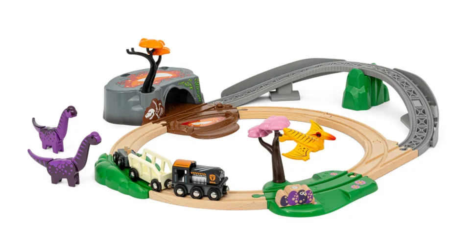Gå på opdagelse i dinosaurernes fantastiske univers med Brio 36094 Togbanesæt med dinosaurer. Togsættet indeholder 21 dele, som giver mulighed for masser af dinosaur- og togleg med et tog med to vogne, flere dekorative dele, som fx den farlige lavagrotte og skinnerne med grønt græs, samt uendelige muligheder for togleg på tværs af forskellige niveauer. Der medfølger tre farverige dinosaurer med unikke bevægelige dele og klassiske BRIO-magneter til at skabe spændende interaktioner i legen.