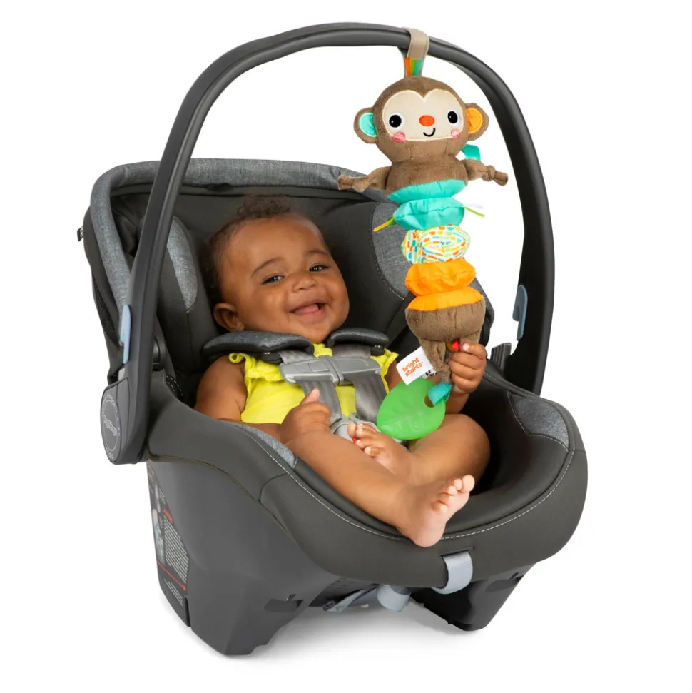 Denne flotte abe fra Bright Starts, som kan trækkes i og leges med, vil skabe glæde hos dig og dit barn, mens I lærer og leger! Et let træk i bladet får aben til at strække sig. Se abens krop udvide og trække sig langsomt sammen i takt med 60 sekunders glade melodier. Dette musikalske legetøj fremmer udviklingen af finmotorikken, synssansen og forståelsen af princippet om årsag og virkning Dit barn vil elske de forskellige bløde materialer, der giver barnet mulighed for at udforske aben, og tilbehør i klare farver, mens du ikke vil kunne modstå de dejlige grin, som dette legetøj frembringer hos dit lille barn! Legetøjet kan nemlig nemt fastgøres til barnevognen, pusletasken og aktivitetsstativet, så din baby aldrig behøver at undvære sit yndlingslegetøj. På denne måde bliver den søde abe hurtigt til familiens yndlingslegetøj. Mål: 15,24 cm x 34,29 cm x 5,08 cm. Legetøjet rengøres med en fugtig klud og mild sæbe og lufttørres. Produktet tåler ikke nedsænkning i vand.