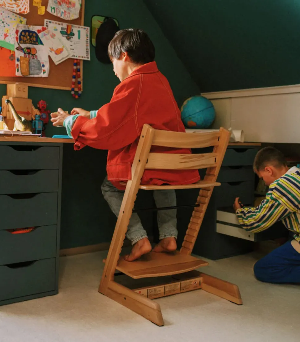 Tripp Trapp® højstolen er designet af Peter Opsvik helt tilbage i 1972 og har været et fast møbel i mange hjem igennem tiden – måske har du som forældre siddet i én? Tripp Trapp® højstolen er produceret i dyrket bøg, som er en stærk træsort, der gør produktet stabilt og holdbart, og sikrer en lang levetid. Højstolen løfter barnet op til spisebordet og skaber nærhed og fællesskab mellem barn og voksen, om det er spisetid eller hyggetid ved spisebordret. Det er let at tilpasse sidde- og fodplade i både højde og i dybden, i takt med at barnet vokser. Dermed opnås en optimal siddestilling med god bevægelsesfrihed, og støtte for både fødder og ryg. Den stabile fodplade giver dit barn sikkerhed og frihed til at bevæge sig på stolen, hvilket stimulerer barnets motoriske udvikling. Fuld fodstøtte sikrer desuden at barnets ben ikke kommer til at sove. Når stolen er justeret korrekt sidder dit barn behageligt og ergonomisk korrekt uanset alder. Med Tripp Trapp® højstolen kommer dit barn til at sidde med ved spisebordet og nyde måltiderne sammen med resten af familien. Det solide og holdbare design gør at Tripp Trapp® stolen kan anvendes som højstol og senere som en ekstra stol – når der er gæster, eller når der er brug for en skrivebordsstol, og med et klassisk look vil stolen aldrig gå af mode.