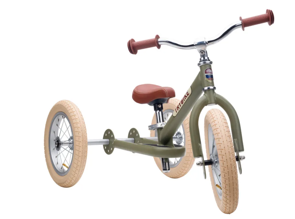Trehjulet løbecykel i metal fra hollandske Trybike, der har mange års erfaring med at sælge og nu også designe løbecykler. Løbecyklen, her er i vintage grøn, har retrolook, brun saddel og store beige hjul med synlige egere. Den er god til et mindre barn, der skal til at træne balance og fornemmelsen for egen krop. Her kan barnet trygt komme i gang med livet som cyklist uden fare for at vælte i forsøget. Når barnet så har fundet balancen kan cyklen let laves om til en tohjulet en af slagsen – uden der er behov for ekstra dele. Forhjulet kan sidde i to højder og sædet justeres fra 30 til 45 centimeter, så cyklen kan tilpasses et barn mellem 15 måneder og seks år. Den vejer 6,3 kilo som trehjulet, men bliver den lavet om til en tohjulet vejer den 5.2 kilo. Cyklen har en lille afsats til fødderne, så når der er godt gang i cyklen og balancen er fundet, så er det let at ræse afsted. Med cyklen følger klistermærker i forskellige design, så barnet selv kan vælge hvilket udtryk cyklen skal have. Selvom cyklen er tænkt til udendørsbrug, så anbefaler Trybike at den bliver opbevaret indenfor, når den ikke er i brug. Trybike i metal har kun været på markedet i ganske kort tid, men har allerede vundet Baby Innovation Award 2018.