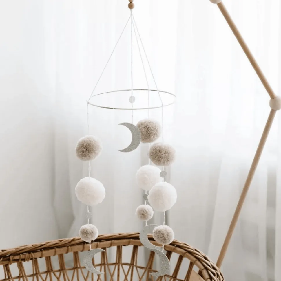 Smuk kombination af håndlavede uld pom poms og skinnende detaljer engagerer din babys fascination af form og farve. Neutrale og pastelltoner giver en delikat indretning til babyens værelse