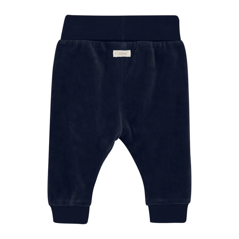 Bløde velourbukser fra FIXONI. Bukserne har en bred ribkant i taljen og ved benåbningerne, som kan foldes for ekstra komfort og fleksibilitet. De er lavet i en blød velourkvalitet, der føles behagelig mod barnets hud.