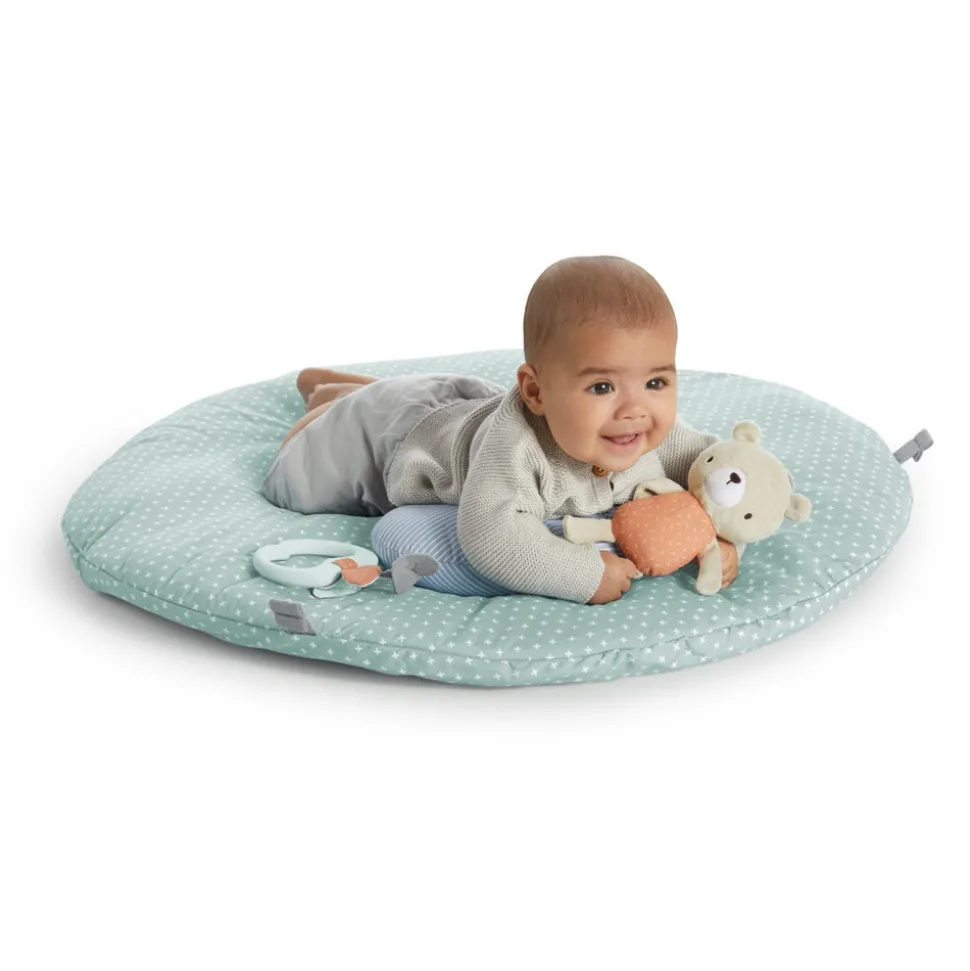 Giv dit barn det mest hyggelige sted at strække ud og lege. Dette aktivitetsstativ er udstyret med en dynemadras. Den kan vendes og er grå på den ene side og grøn på den anden. Dynen er så blød og rar for den lille at ligge på. Til den naturfarvede trælegetøjsbjælke følger der diverse aktivitetslegetøj med samt en pude hvor den lille kan øve finmotorikken. Aktivitetsstativet kan foldes sammen og kan nemt transporteres.