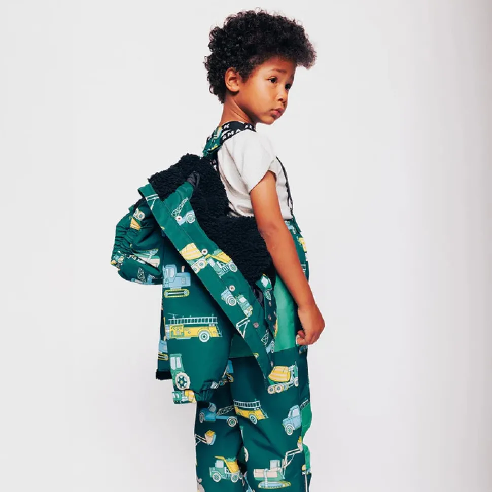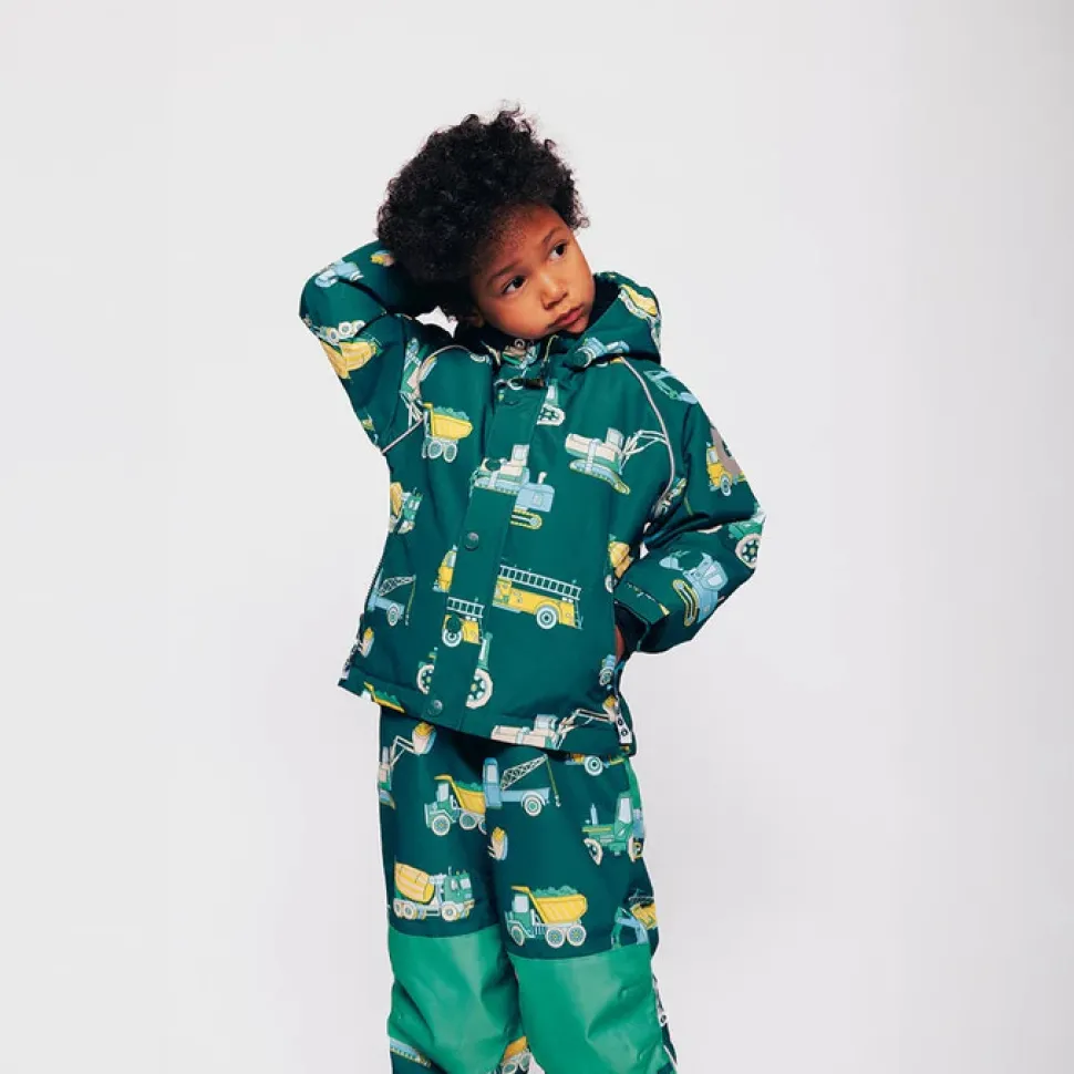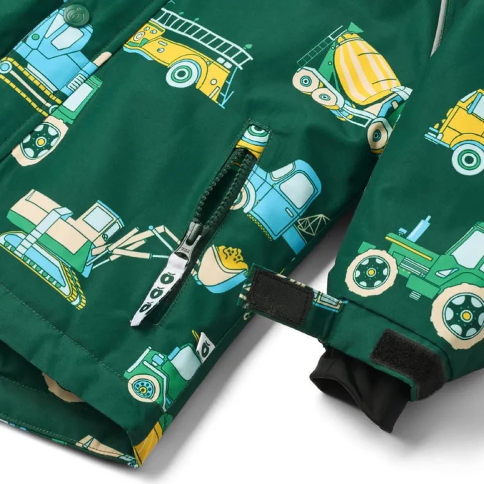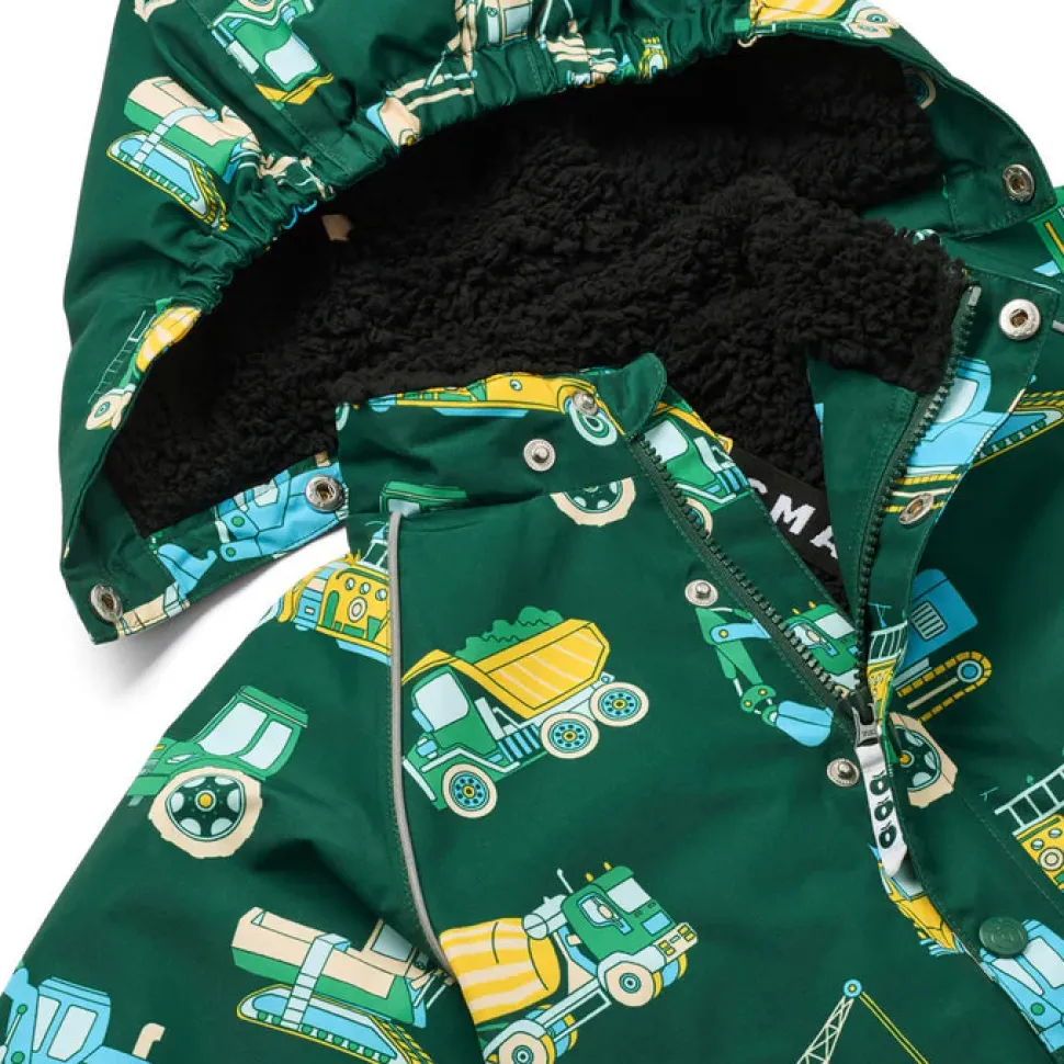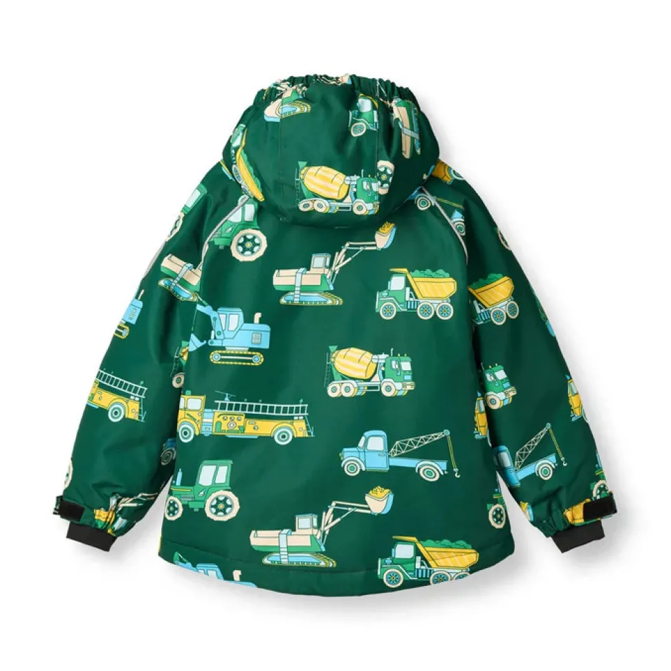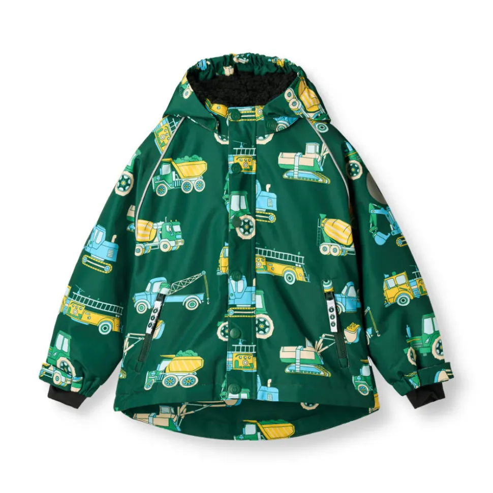 Vinterjakke med køretøjer. Jakken har en lynlås foran og en aftagelig hætte med teddy fleece. Jakken har seler samt justerbar vindfang i bunden af jakken, samt vindfang og velcrolukning ved håndleddene der også kan justeres. Vinterjakken har refleks piping ved armene.
