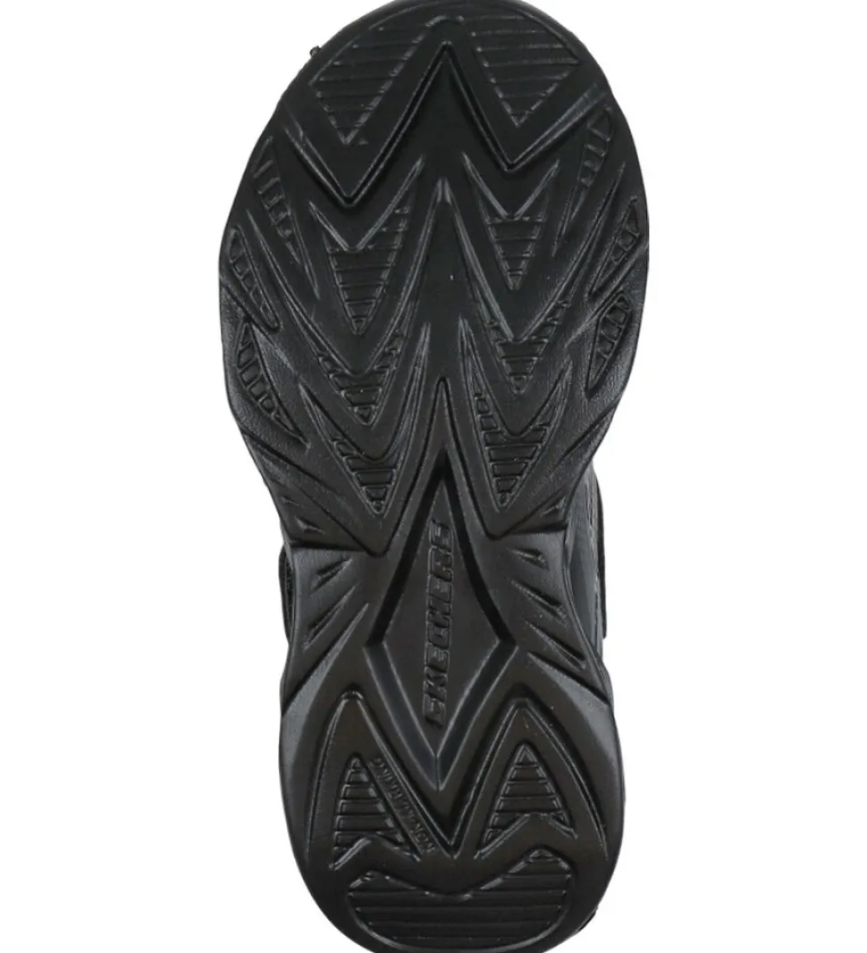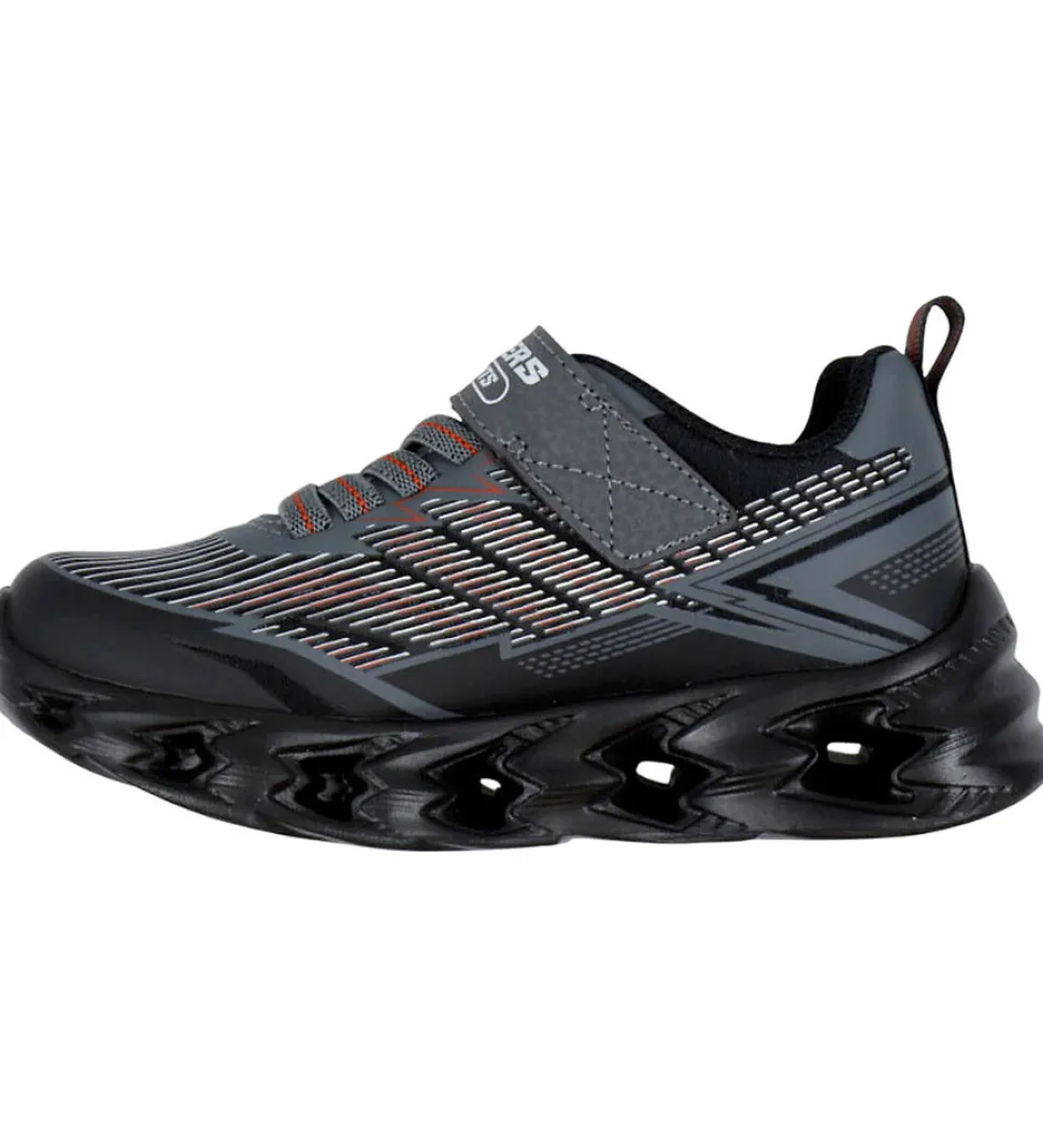 Smarte Skechers-skor i svart och mörkgrått med smala ränder i vitt och rött och ett logotryck på utsidan samt på kardborrebandet. Skorna har inbyggd LED-ljud i yttersulorna som aktiveras när barnet går och springer. Ljuset kan tändas och släckas med en knapp på kardborrebandet.
