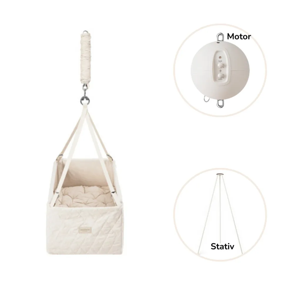 Moonboon Cradle er mere end bare et sted at sove – det er en investering i hele familiens velbefindende. Med ekstraudstyr som en støjsvag gyngemotor og et robust stativ får du en fleksibel og sikker løsning, der vokser med dit barn. Lad dit barn falde i søvn sikkert – hver gang.