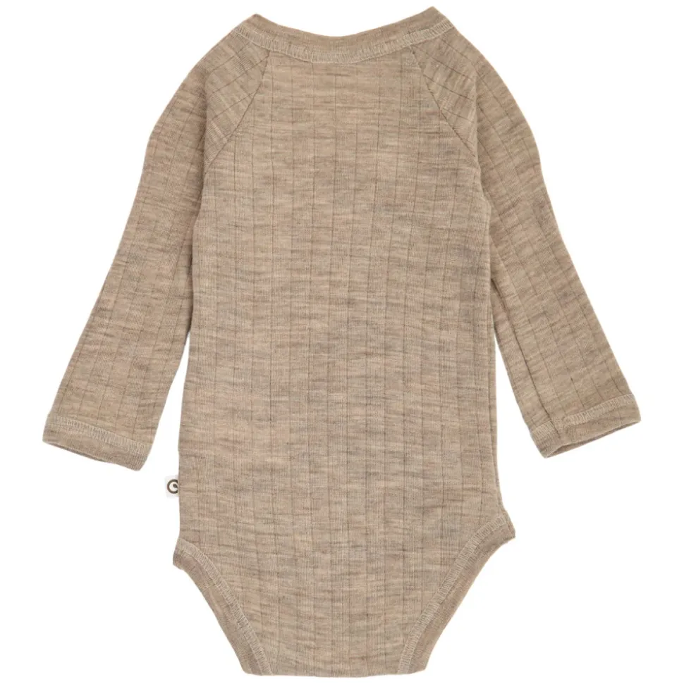 Dejlig blød merinould rib body med kryds lukning. Bodyen kan åbnes helt op fortil med tryklåse så bodyen ikke skal ned over hovedet på baby. Bodyen har ydermere tryklåse i bunden. Denne body er lavet fra str. 44-74 og passer derfor til helt små babyer. Fremstillet i en dejlig blød 100 % merinould rib (GOTS Organic Certified by Ecocert Greenlife Lic. No. 152033). Produktet er GOTS organic- certificeret, hvilket betyder at bomulden er certificeret økologisk, og at der i alle andre processer som farvning, strikning og syning er taget de strengeste hensyn til miljøet. GOTS er internationalt anerkendt som den førende standard for forarbejdning af tekstiler af økologisk bomuld. Derudover tages der også hensyn til arbejdsforholdene, hos dem der producerer tøjet. Økologisk uld 100%