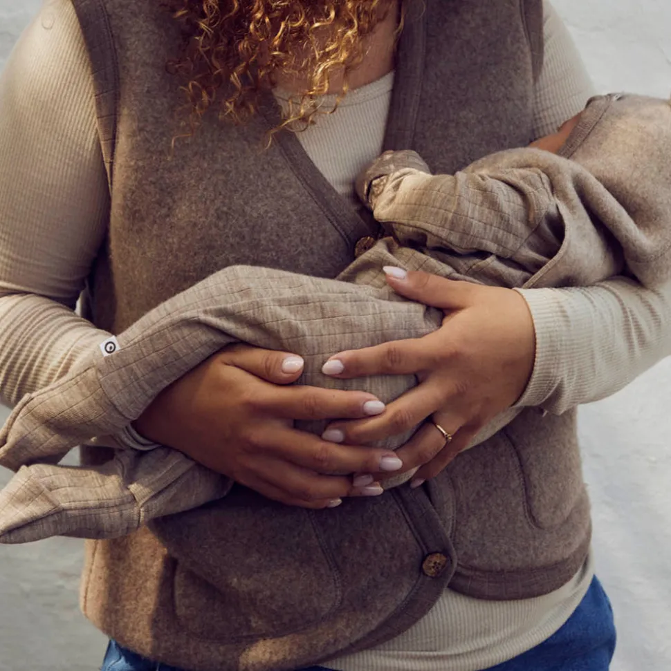 Skøn heldragt i blød merinould rib kvalitet. Heldragten lukkes fortil med tryklåse og har vendbare fødder og hænder. Dragten er perfekt til de små for at sikre at de ligger lunt og trygt. De vendbare fødder og hænder kan foldes efter behov. Denne heldragt er fremstillet fra str. 44-74 og passer derfor til meget små babyer. Fremstillet i blød 100 % merinould-rib (GOTS Organic Certified by Ecocert Greenlife Lic. No. 152033). Produktet er GOTS organic- certificeret, hvilket betyder at bomulden er certificeret økologisk, og at der i alle andre processer som farvning, strikning og syning er taget de strengeste hensyn til miljøet. GOTS er internationalt anerkendt som den førende standard for forarbejdning af tekstiler af økologisk bomuld. Derudover tages der også hensyn til arbejdsforholdene, hos dem der producerer tøjet. Økologisk uld 100%
