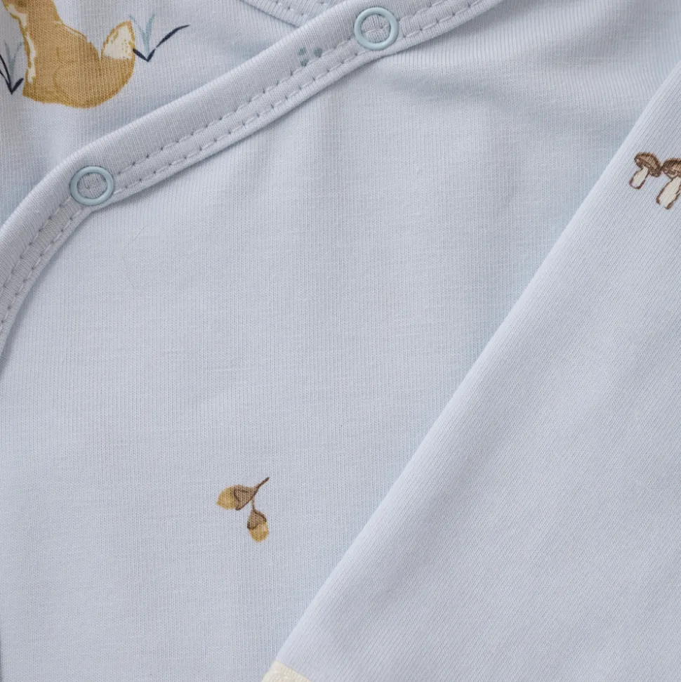 Langærmet slå-om-body med all-over-print fra FIXONI. Bodyen åbnes nemt med trykknapper foran og mellem benene, hvilket gør den praktisk ved både påklædning og bleskift.