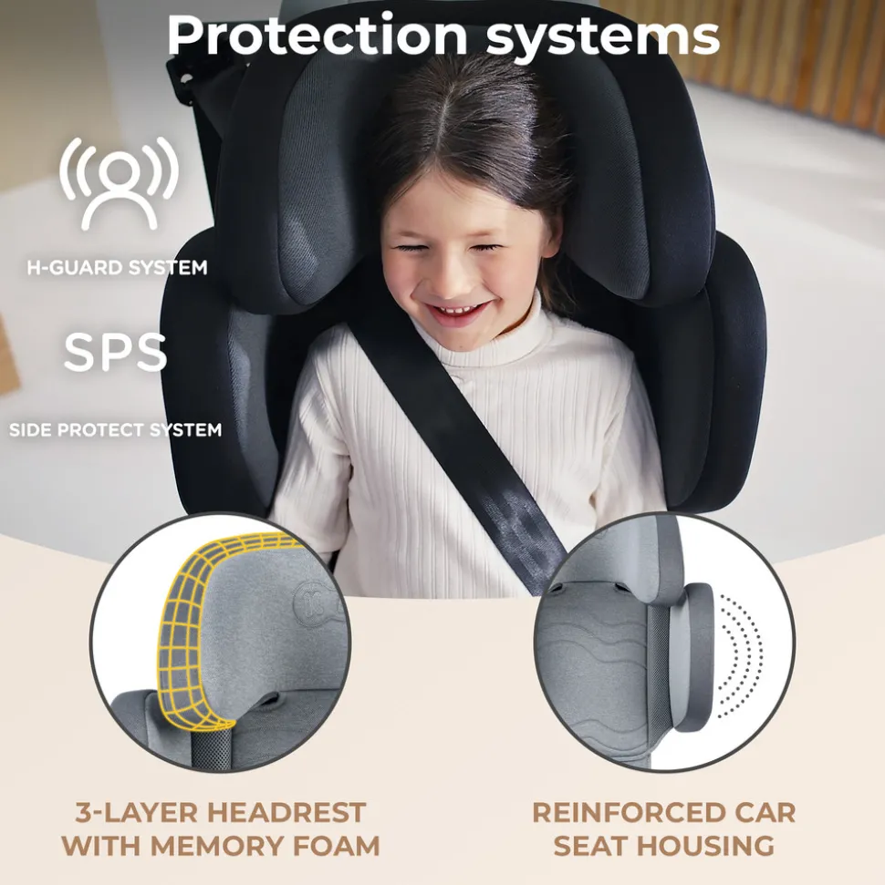 XPAND 2 i-Size autostolen har også ekstra sikkerhedssystemer, som SPS (Side Protect System) og H-Guard system. Forstærkede sidestykker og 3-lags nakkestøtte med memory skum absorberer energien, som genereres ved kollision og beskytter derved barnets hoved, skuldre og hofter. XPAND 2 i-Size monteres nemt med ISOFIX, som er udstyret med indikatorer. De eliminerer risiko for forkert montering af autostolen. Når indikatorerne lyser grønt, betyder det, at autostolen er fastgjort korrekt.