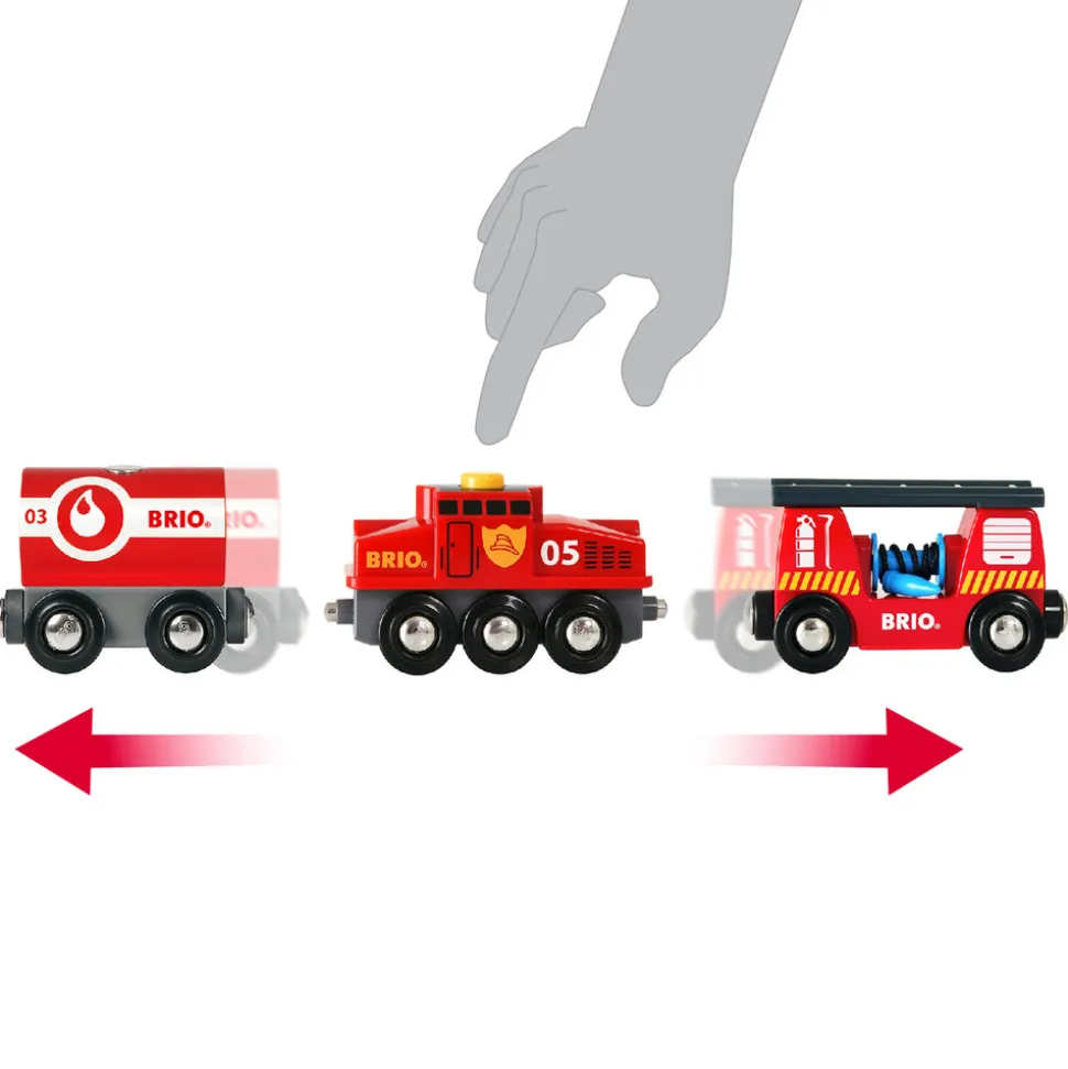 Tryk på knappen på lokomotivet, så kobler du vognen af for hurtig hjælp. Kør tæt på branden, og sluk ilden med brandslangen og vand fra tankvognen.