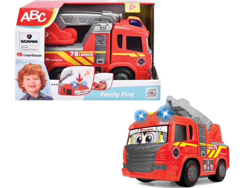 Scania brandbil fra ABC med frihjul, lys, lyd og stige der kan svinges til siderne. Motoriseret kørsel frem/tilbage. 25 cm. Fra 2 år.