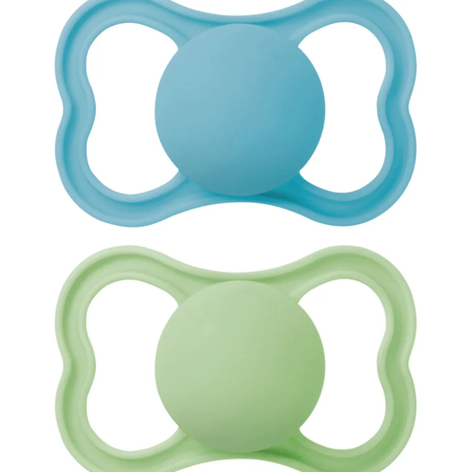 MAM Air har en flad, symmetrisk sut og ekstra store lufthuller, så barnets følsomme hud kan ånde. Det specielle design gør også, at forældrene kan se barnets smil, selv når sutten er i brug. Sugedelen er lavet af silkeblød silikone, MAMSkinSoftTM-silikone som føles blød og velkendt, ligesom mors hud, og som accepteres af 94% af alle babyer*. Sutterne leveres i en praktisk opbevarings- og steriliseringsæske, der gør det nemt at sterilisere sutterne i mikrobølgeovnen.