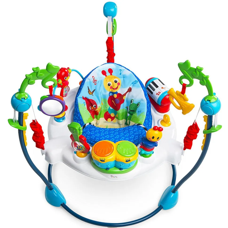 Prisvindende aktivitetsstation fra Baby Einstein med hoppeeffekt og masser af stimulans i form af en symfoni af sjov, leg og musik for den lille. Produktet indebærer bongotrommer og en elektronisk legetøjsstation med lys, lyde samt flere forskellige sprog, herunder: Engelsk, fransk og spansk. Sædet kan rotere 360 °, så babyen kan nå alle legetøjsstationerne. Derudover har sædet ekstra polstring og højere ryg for komfort og støtte til den lille. Derudover er der fire højdejusteringer for at tilpasse babyens højde. Sædet tåler vaskemaskine med kold vand. Ingen blegemiddel. Legetøjet tørres af med en fugtig klud.