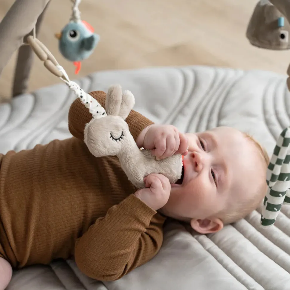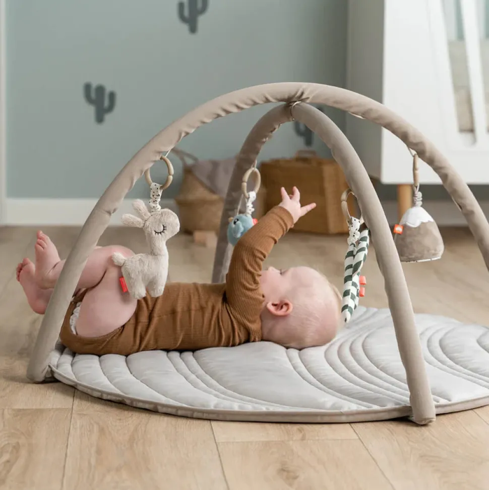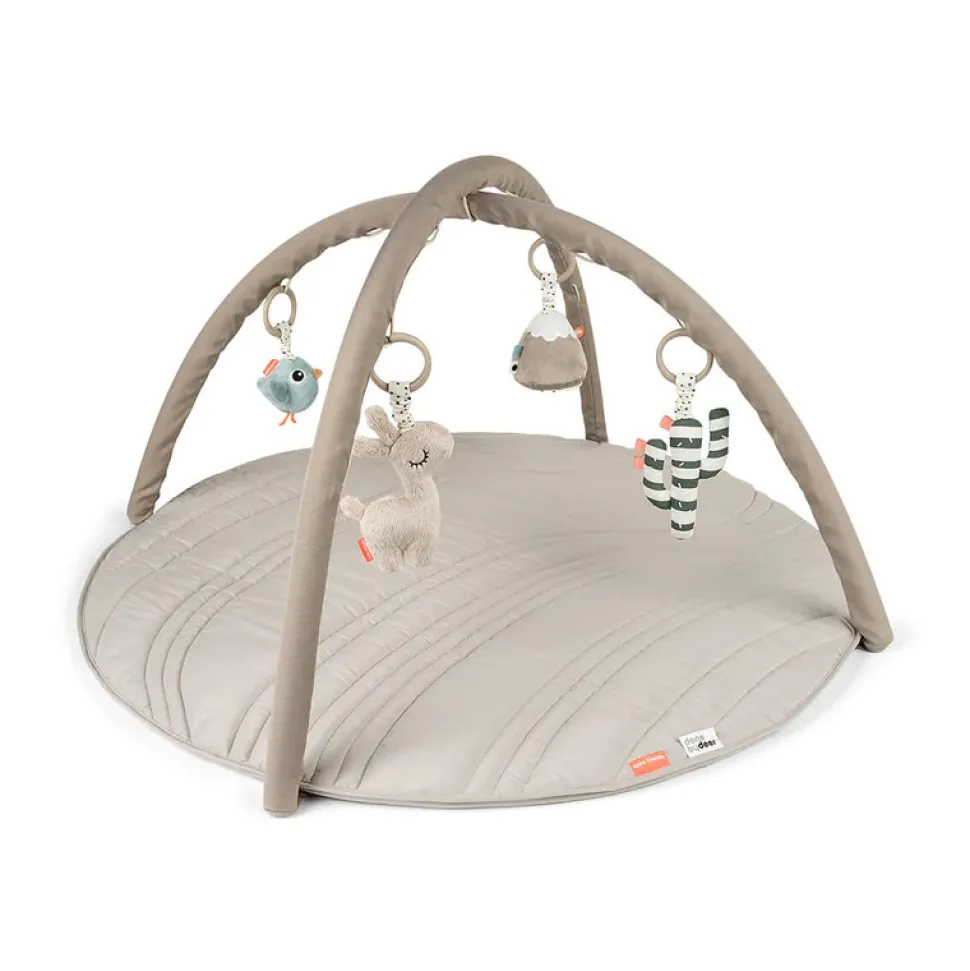 Rør, grib, lyt og se – dette aktivitetsstativ med blødt tæppe vil stimulere og fastholde dit barns interesse med alle de søde og sjove aktiviteter. Det medfølgende legetøj kan hænges i 13 forskellige positioner på de 2 buer så det hele tiden passer til dit barns alder og udvikling. Opdag den knitrende lyd når dit barn griber ud efter Lalee eller den lille kaktus, hør Birdees søde klokke og lad dit barn have det sjovt med at fange sit spejlbilledet i det lille spejl.