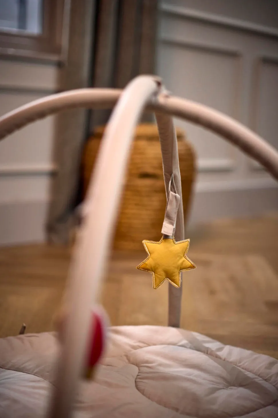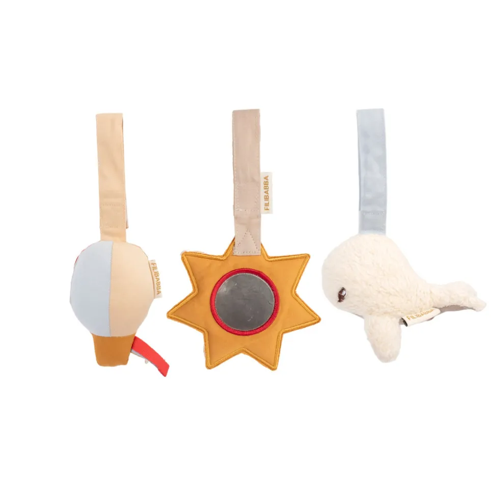 De tre legetøj er designet til at støtte sanseudvikling og fantasifuld leg. De er ideelle til brug sammen med et aktivitetstæppe eller til selvstændig udforskning. Hvert legetøj i dette charmerende sæt har sin egen unikke charme, som fanger dit barn opmærksomhed og opfordrer til leg. Christian-hvalen er lavet af blødt sherpa-stof og har knitrende papir, der giver både taktil og auditiv stimulering. Den farverige luftballon, komplet med legende snore og en blid klokke, er perfekt til at vække nysgerrighed. Endelig inviterer stjernespejlet til selvopdagelse og fanger visuel opmærksomhed.