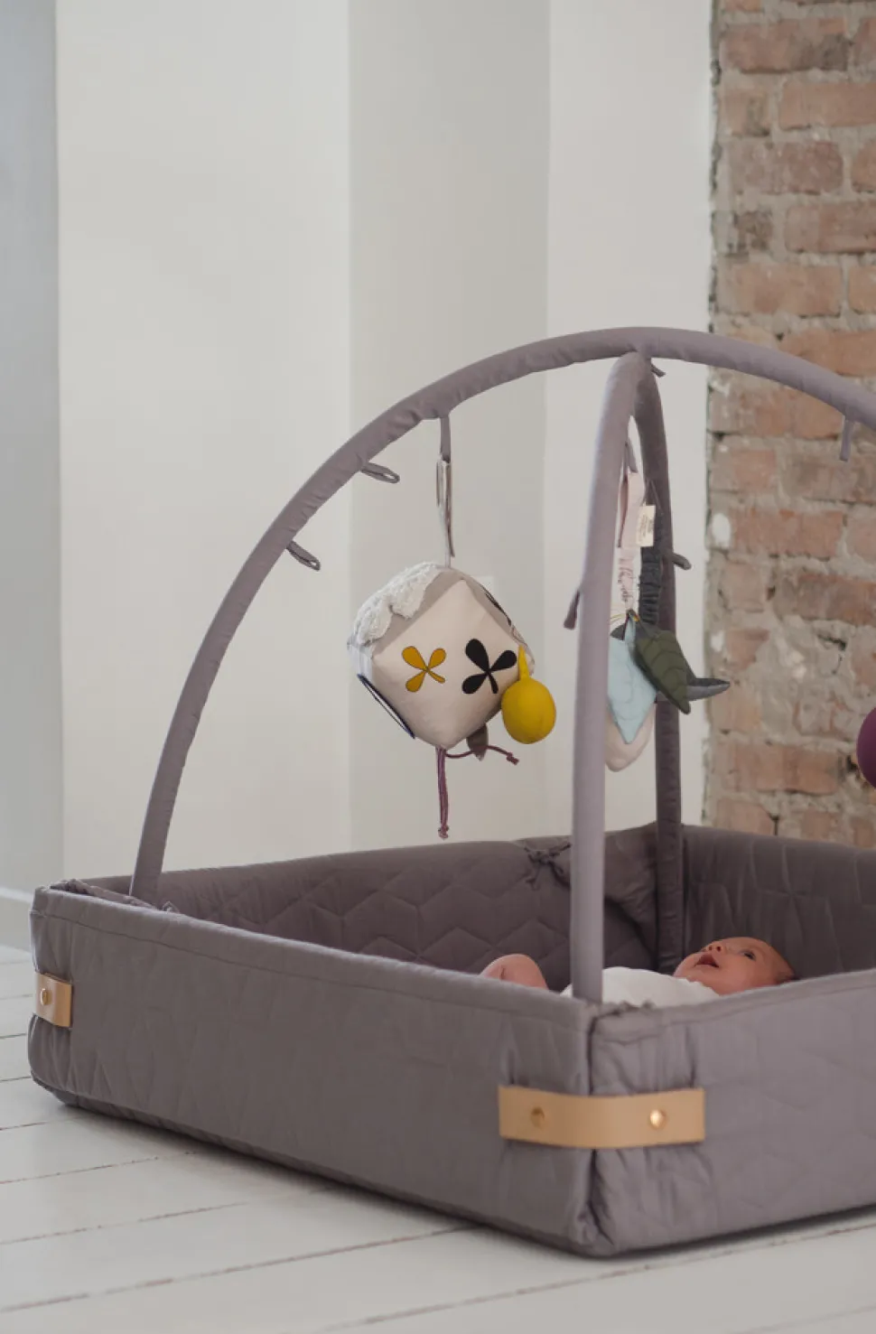 Aktivitetsnesten er udviklet til at vokse med barnet, da den har flere funktioner. Brug den som kravlegård, aktivitetstæppe, legetæppe, babynest. Når baby er helt lille kan aktivitetsnesten med fordel bruges med siderne lukket og med aktivitetsstænger på, til at hænge legetøj i eller stængerne kan tages helt af og man har en større baby nest – evt. til tvillinger. Samtidig kan siderne foldes ned, hvis man vil sidde på tæppet sammen med den lille eller når den lille begynder at kravle rundt. Når barnet bliver større kan man bruge den som legetæppe med siderne foldet ned og uden stænger monteret. Aktivitetsnesten lukkes med læderspænder der klikkes fast med en trykknap.