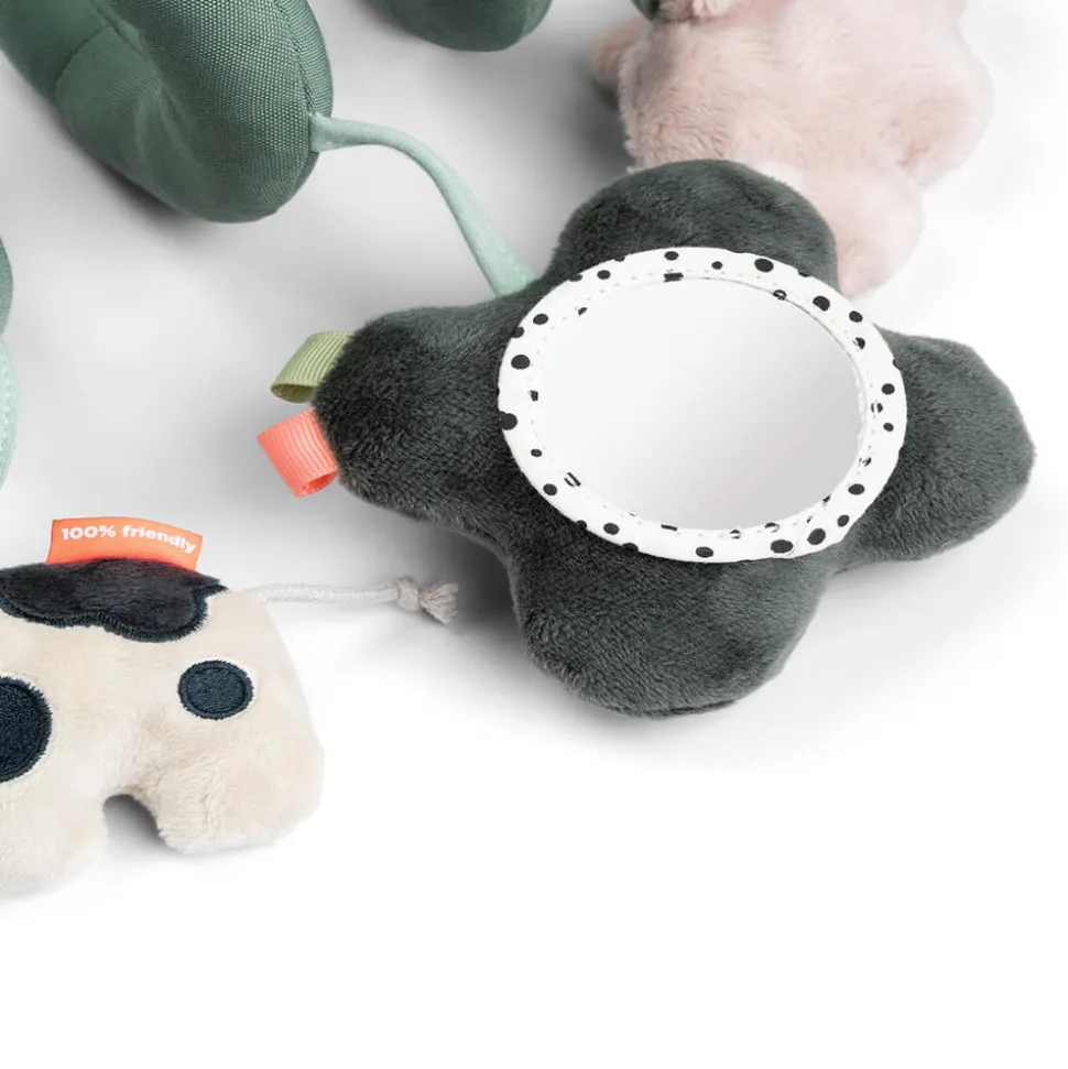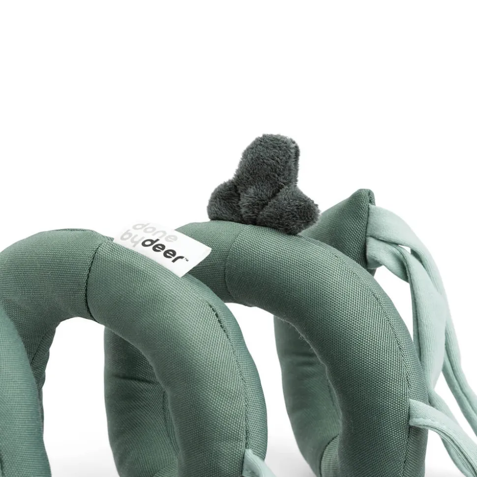 Legetøjet er let at binde på siden af sengen, autostolen eller barnevognen, så det altid er inden for rækkevidde. Den seje grønne farve, kombineret med farverige detaljer og kontraster, giver visuel stimulering, der fanger dit barns opmærksomhed.
