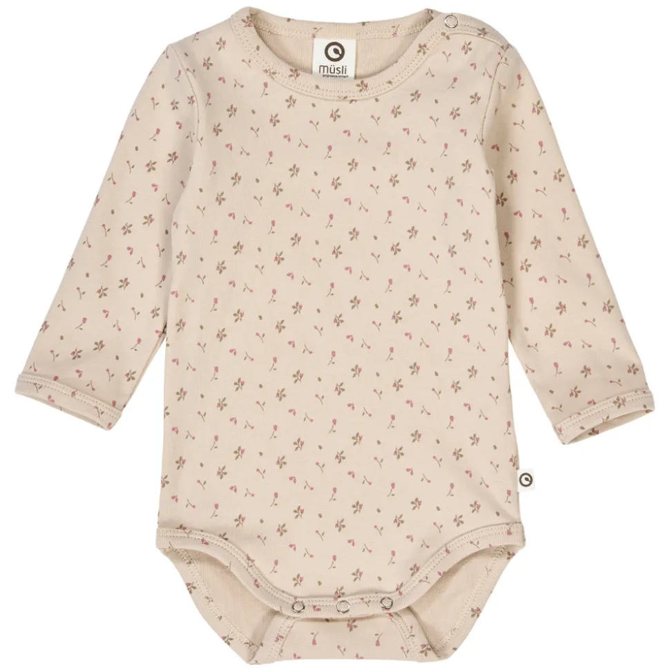 Denne fine body er dekoreret med et smukt, gennemgående blomsterprint, der giver et sødt og naturligt udtryk. Den lukkes nemt med trykknapper i både halsåbningen og forneden, hvilket gør den praktisk i hverdagen.