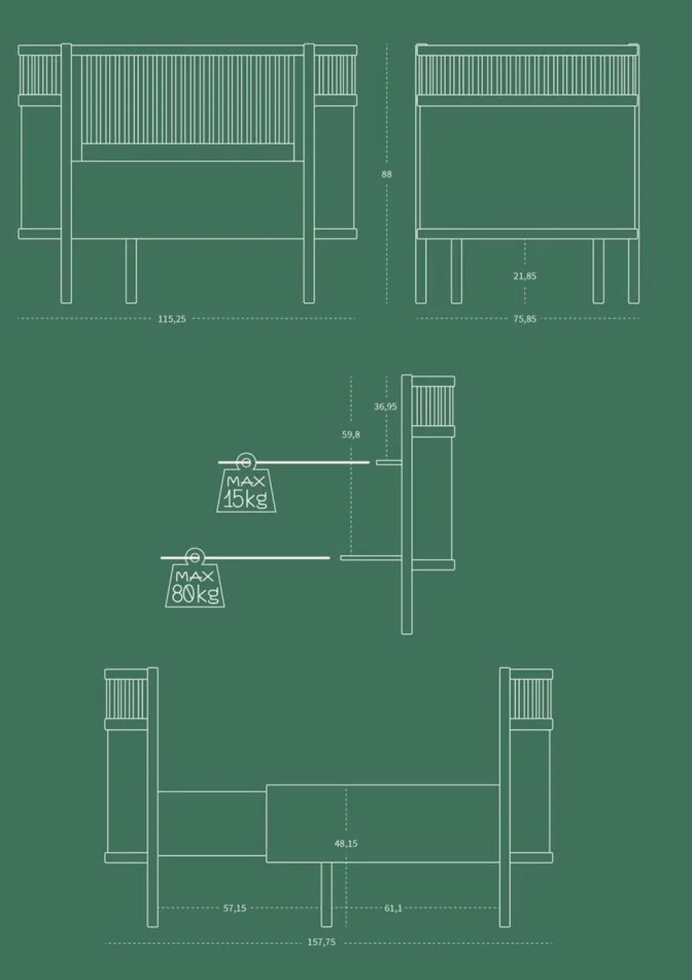 Mål på sengen L: 115 x B: 75,8 x H: 88 cm.